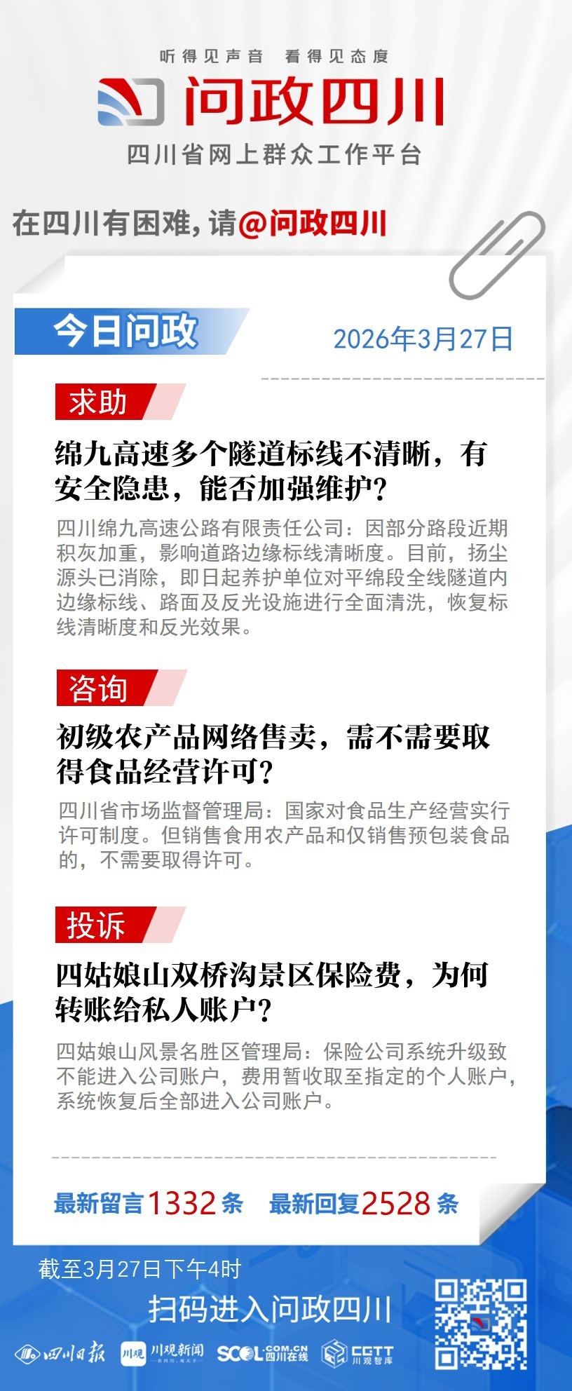在四川有困难,找问政四川。如果您在四川遇到了操心事、烦心事、揪心事,请登录“四川省网上群众工作平台—问政四川”或拨打问政四川热线(028-96001)留言反映、求助或建议。我们将充分发挥平台的互动联系作用及舆论监督功能,第一时间传递民声,推动问题得以及时解决——听得见声音,看得见态度。