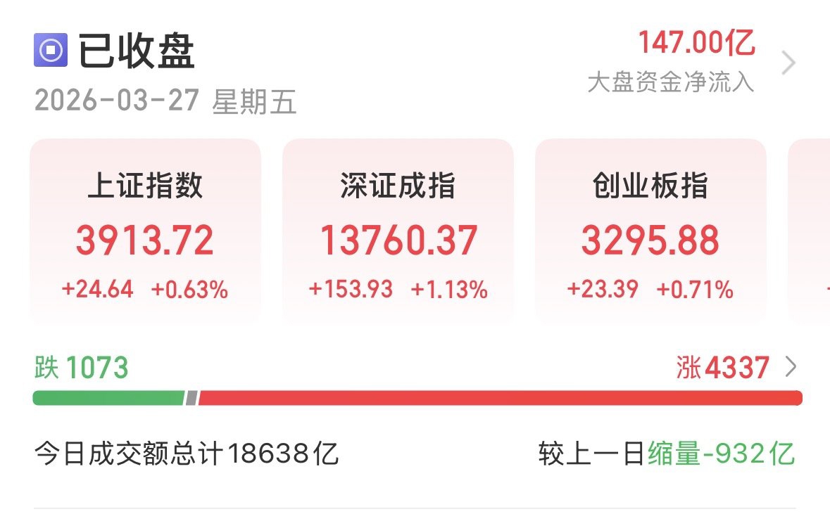 3月27日,A股三大指数低开高走。截至收盘,上证指数涨0.63%,收报3913.72点;深证成指涨1.13%,收报13760.37点;创业板指涨0.71%,收报3295.88点。全市场成交额超1.8万亿元,较昨日缩量近千亿元。