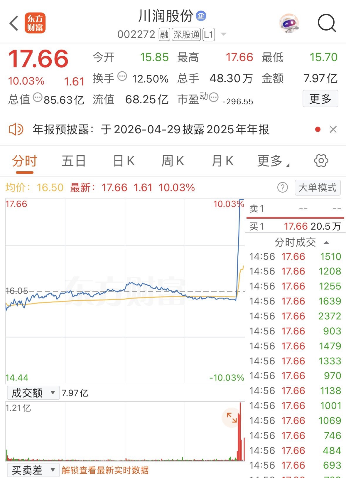 川润股份走势图。东方财富App截图