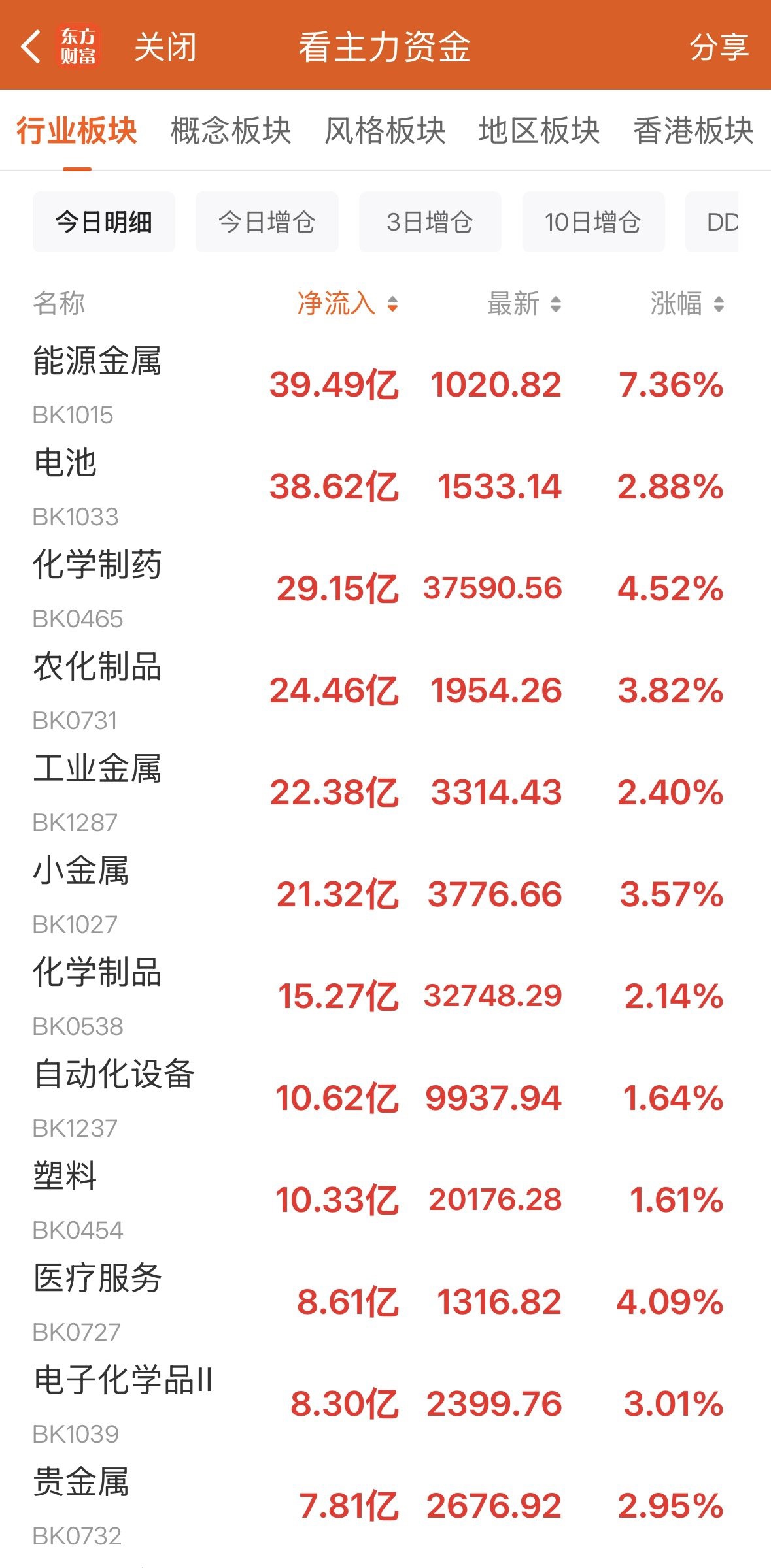 行业板块资金流入情况。东方财富App截图