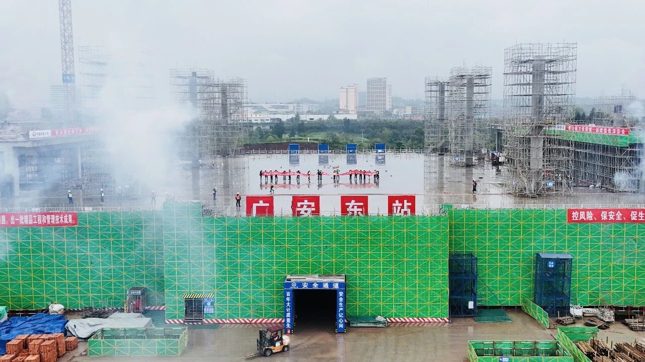 3月24日,广安东站站房主体结构顺利封顶。图据西南铁路