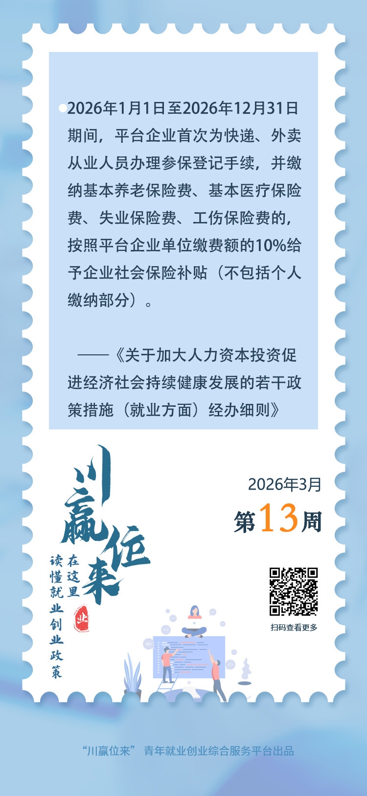 四川的快递员、外卖配送员在社保权益维护方面迎来一项利好。根据四川省人力资源和社会保障厅近日印发的《关于加大人力资本投资促进经济社会持续健康发展的若干政策措施(就业方面)经办细则》,在今年1月1日至12月31日期间,平台企业首次为快递、外卖从业人员办理参保登记手续,并缴纳基本养老保险费、基本医疗保险费、失业保险费、工伤保险费的,按照平台企业单位缴费额的10%给予企业社会保险补贴,不包括个人缴纳部分。