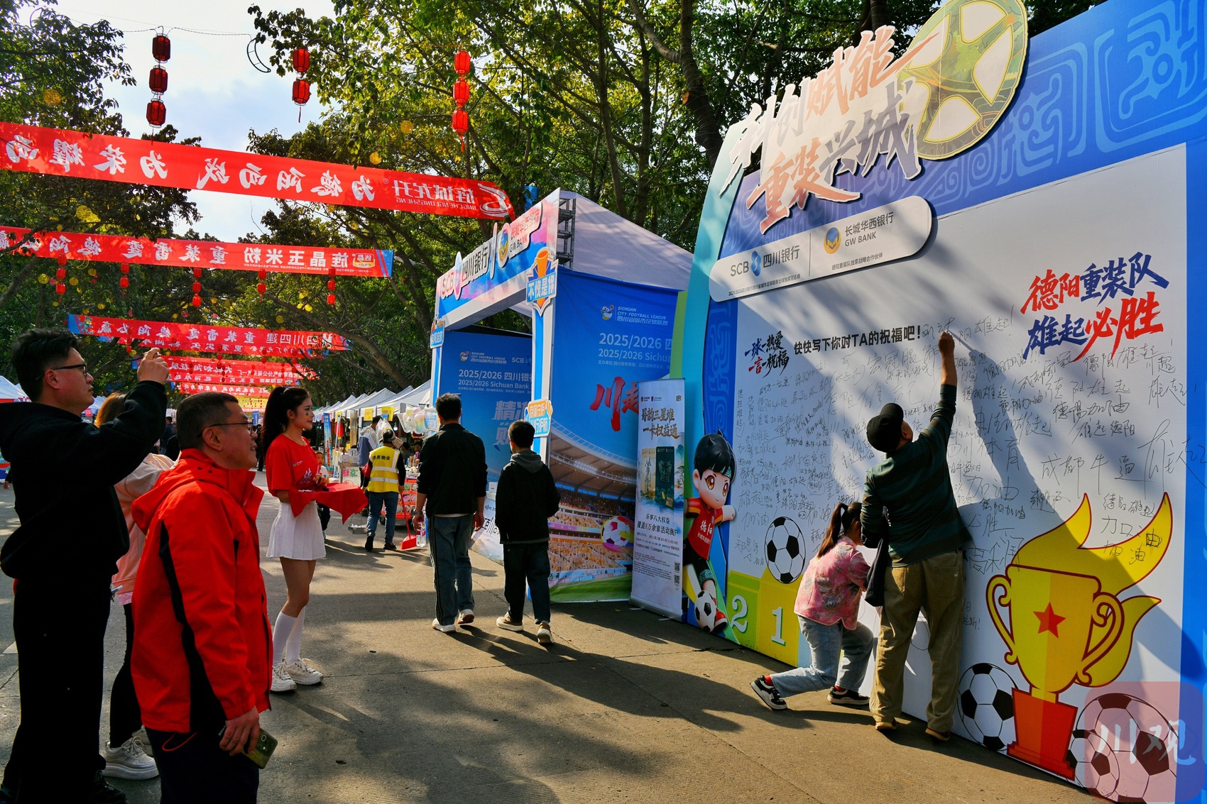 虽然比赛定于晚上7点35分才正式开球,但下午3点,体育场外围早已人声鼎沸,战前氛围浓厚。一场别开生面的足球嘉年华率先开启,吸引了大量市民参与。趣味游戏、赢取奖品的互动环节让现场欢声笑语不断。在“助威德阳重装队 雄起必胜”的签名墙上,市民们纷纷留下自己的祝福与期盼。