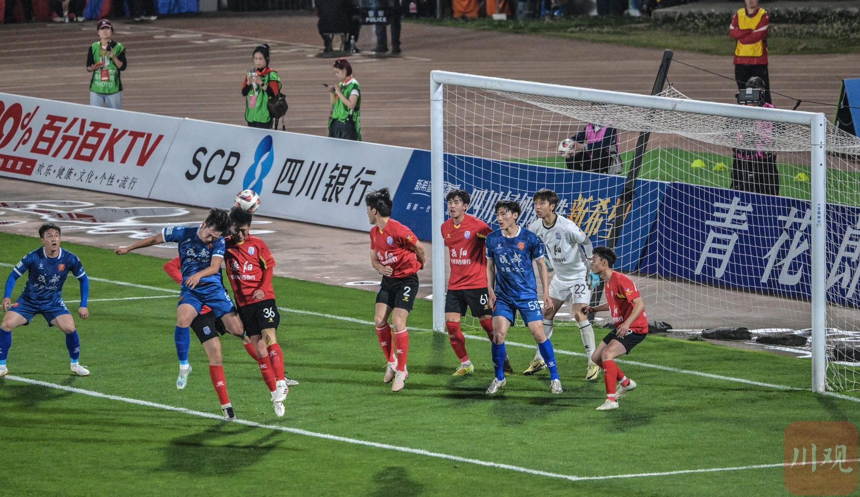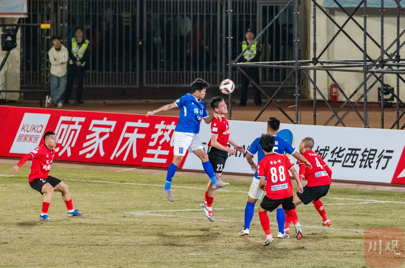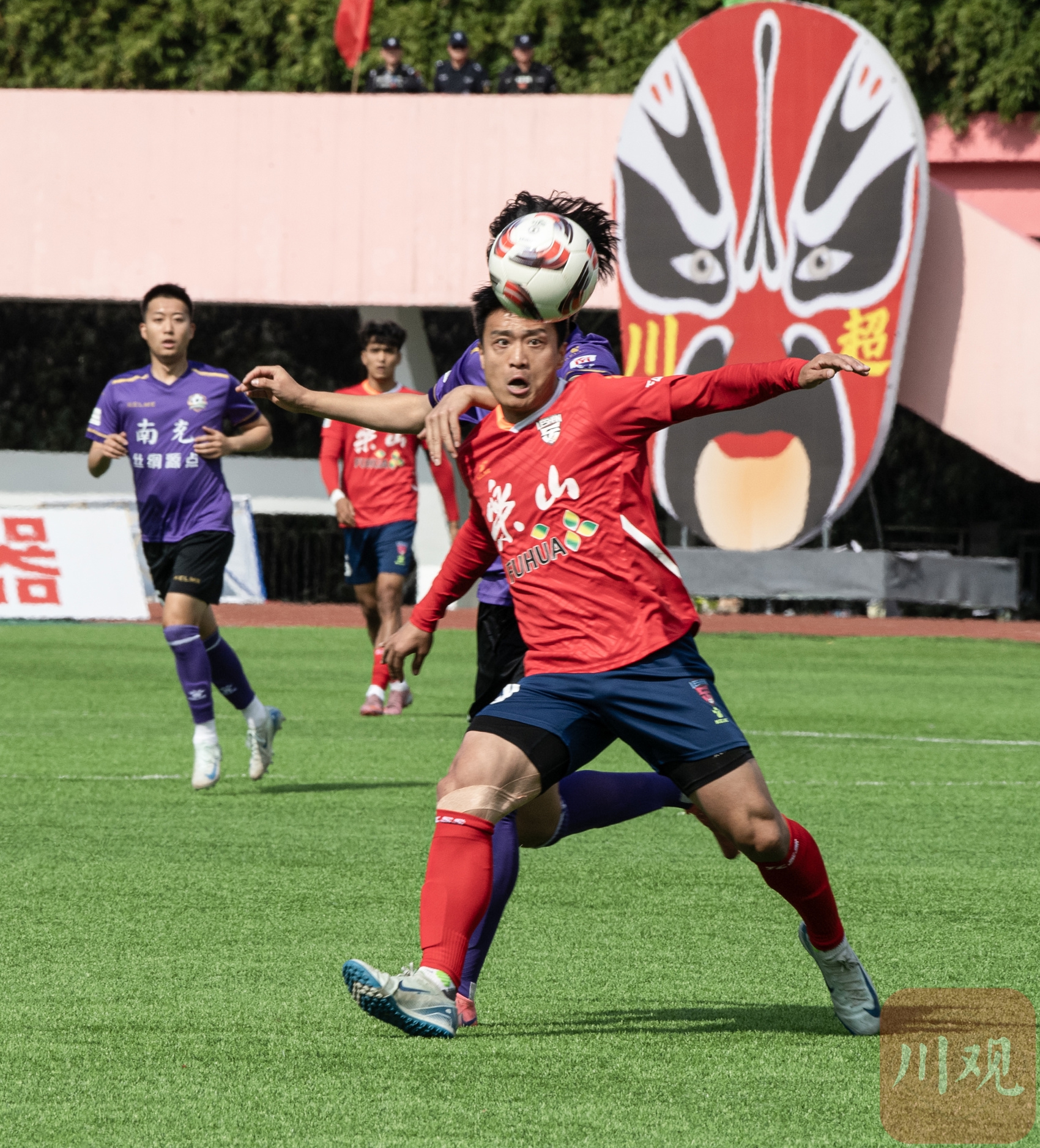 达州川汉子队对阵绵阳九洲长虹队现场,两队球员拼抢头球。C视觉签约摄影师 陈琨