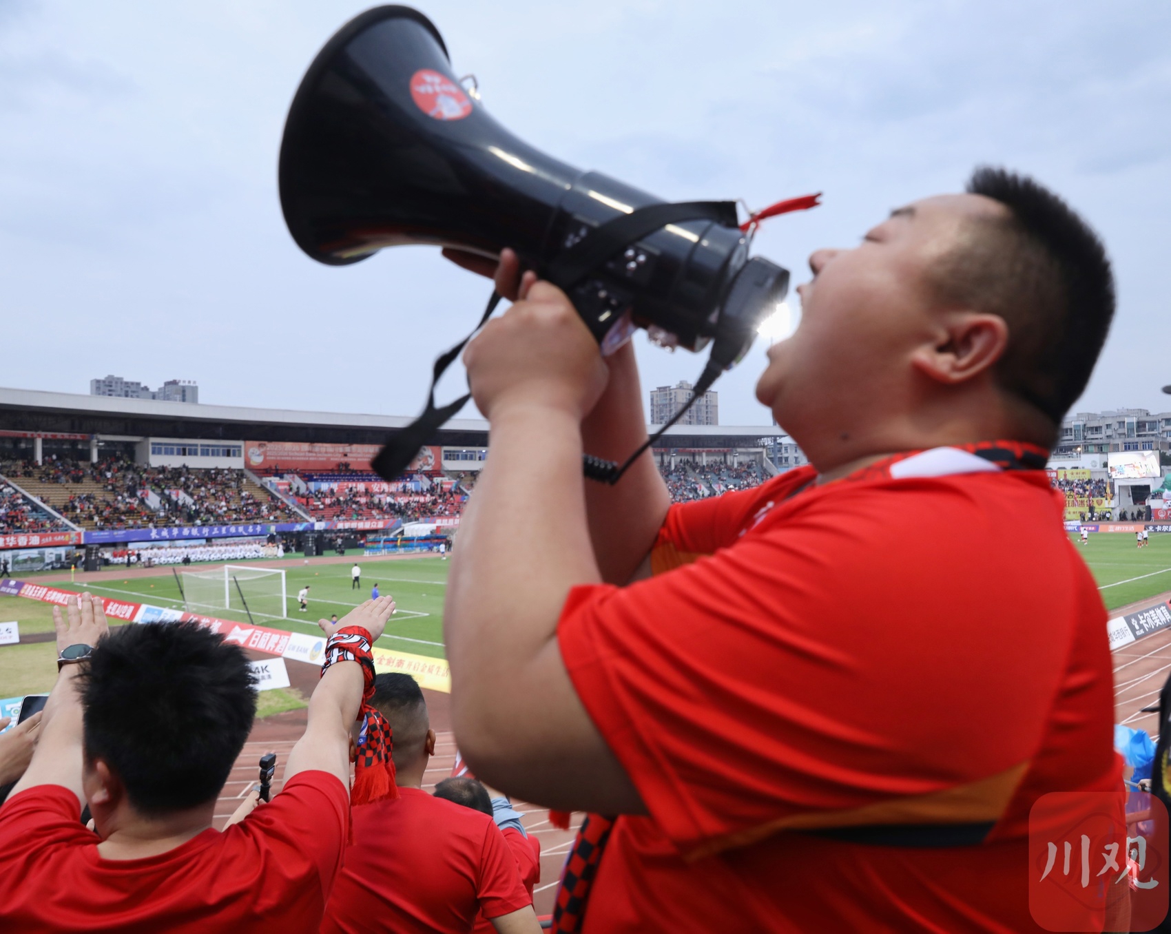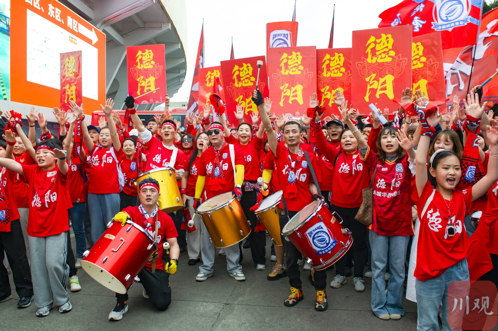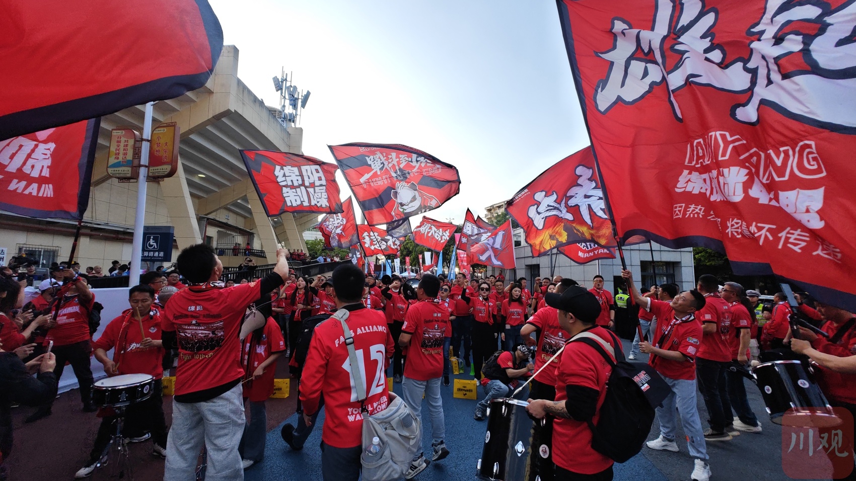 赛前的达州市体育中心,远道而来的绵阳球迷正在集结助威。C视觉签约摄影师 陈琨