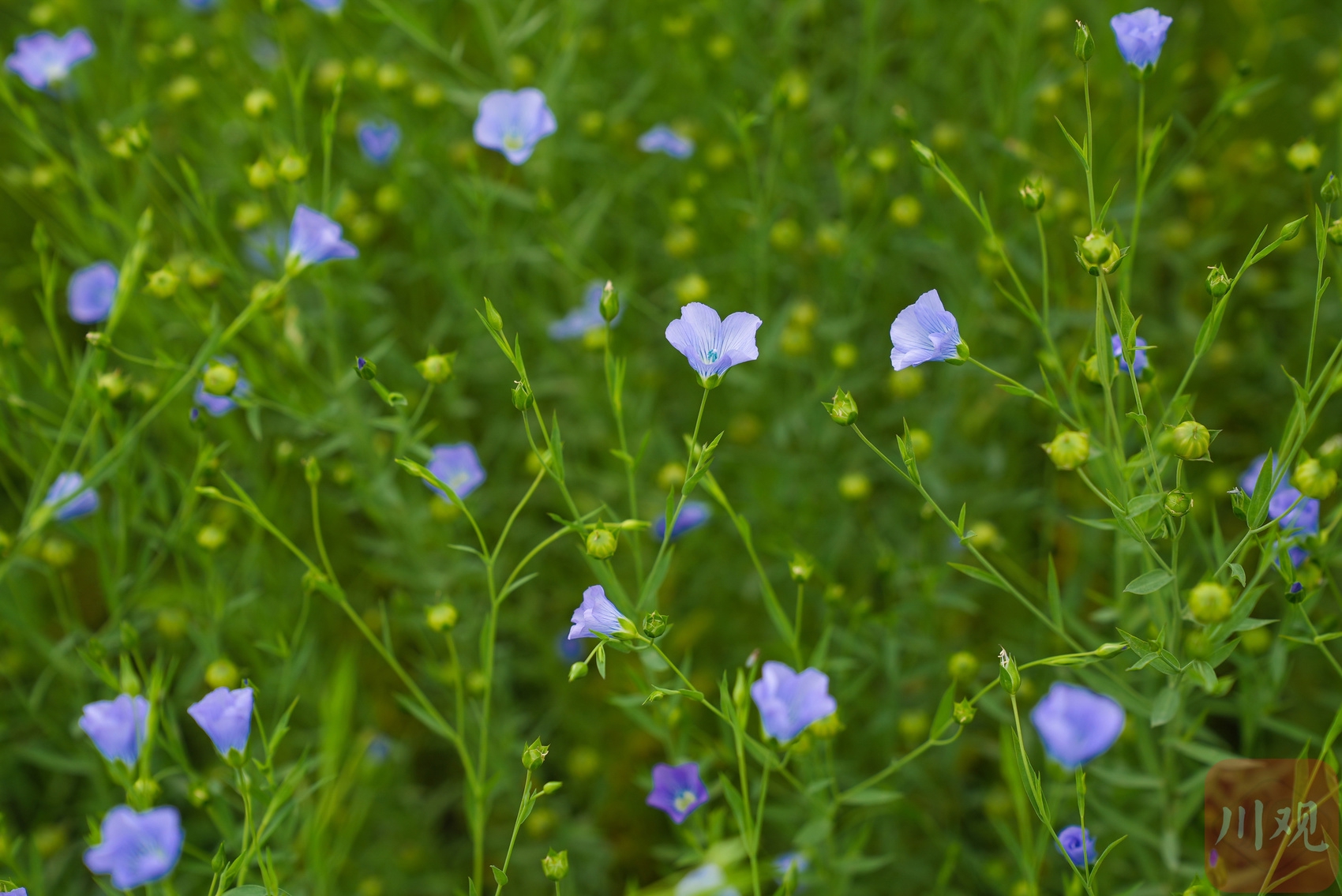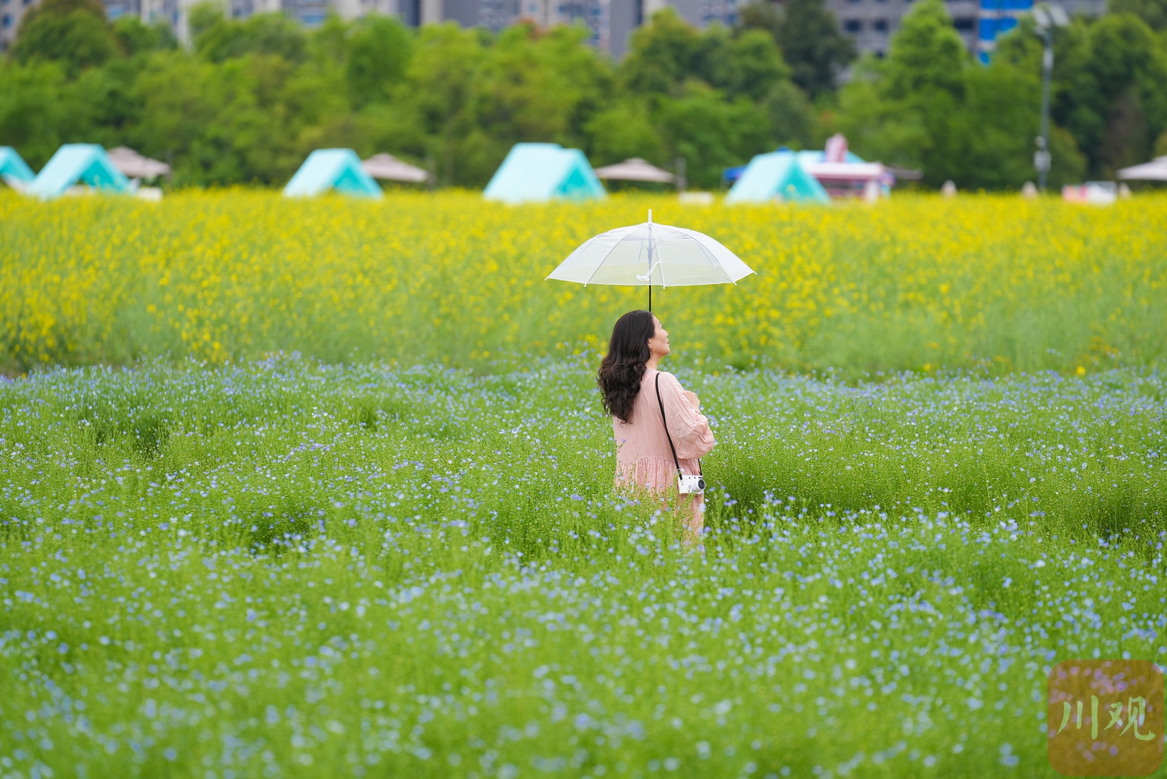游客撑伞在花田间拍照,蓝色的亚麻花正值盛花期,与周边金黄的油菜花交织错落。