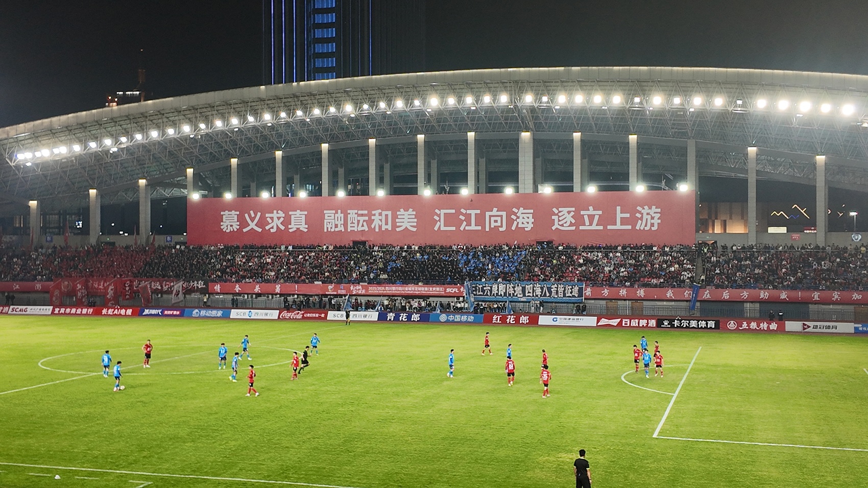 同一天晚上,2026年宜宾市大学生体育联赛在南溪区拉开帷幕。此次联赛包含篮球、足球、乒乓球和羽毛球四个项目。开幕式后,篮球联赛揭幕赛打响,宜宾学院与成都外国语学院的年轻学子在赛场上挥洒汗水,赢得阵阵喝彩。