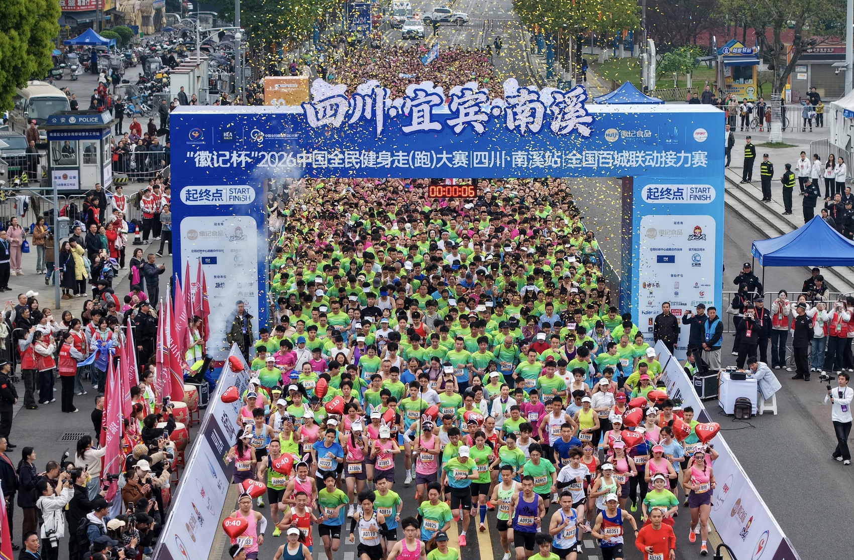3月22日,2026中国全民健身走(跑)大赛(四川·南溪站)全国百城联动接力赛激情开跑。来自全国各地的4800余名跑者从宜宾市南溪区仙源广场出发,沿着赛道朝终点冲刺。