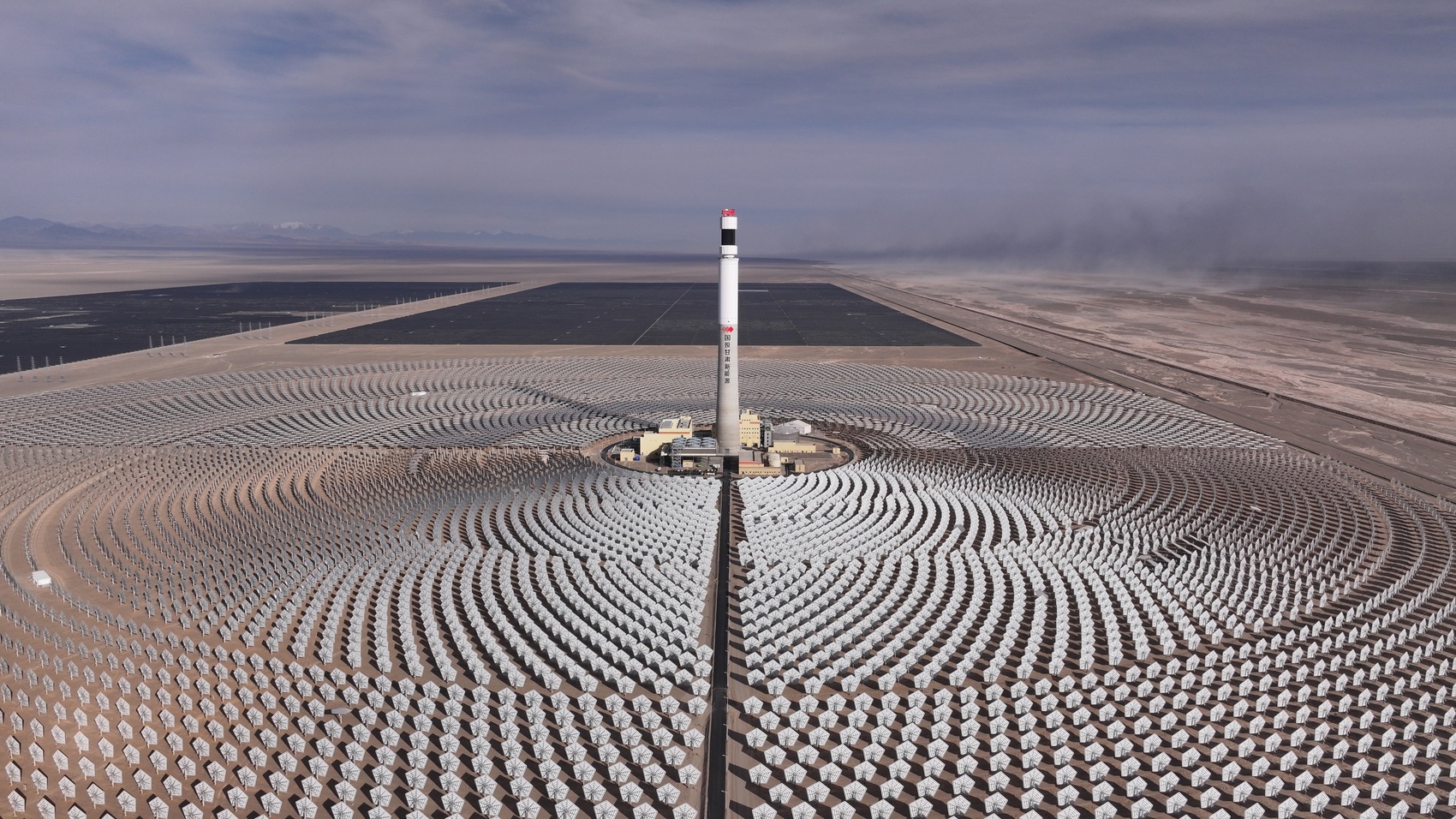 西藏安多,世界最高海拔的100兆瓦熔盐塔式光热发电站正在建设之中。1.6万面、总面积达80万平方米的定日镜将太阳光反射至吸热塔,使熔盐升温至560℃以上,再通过高温熔盐与水进行逆流换热,实现机械能向电能的转化,输出持续稳定的清洁能源。