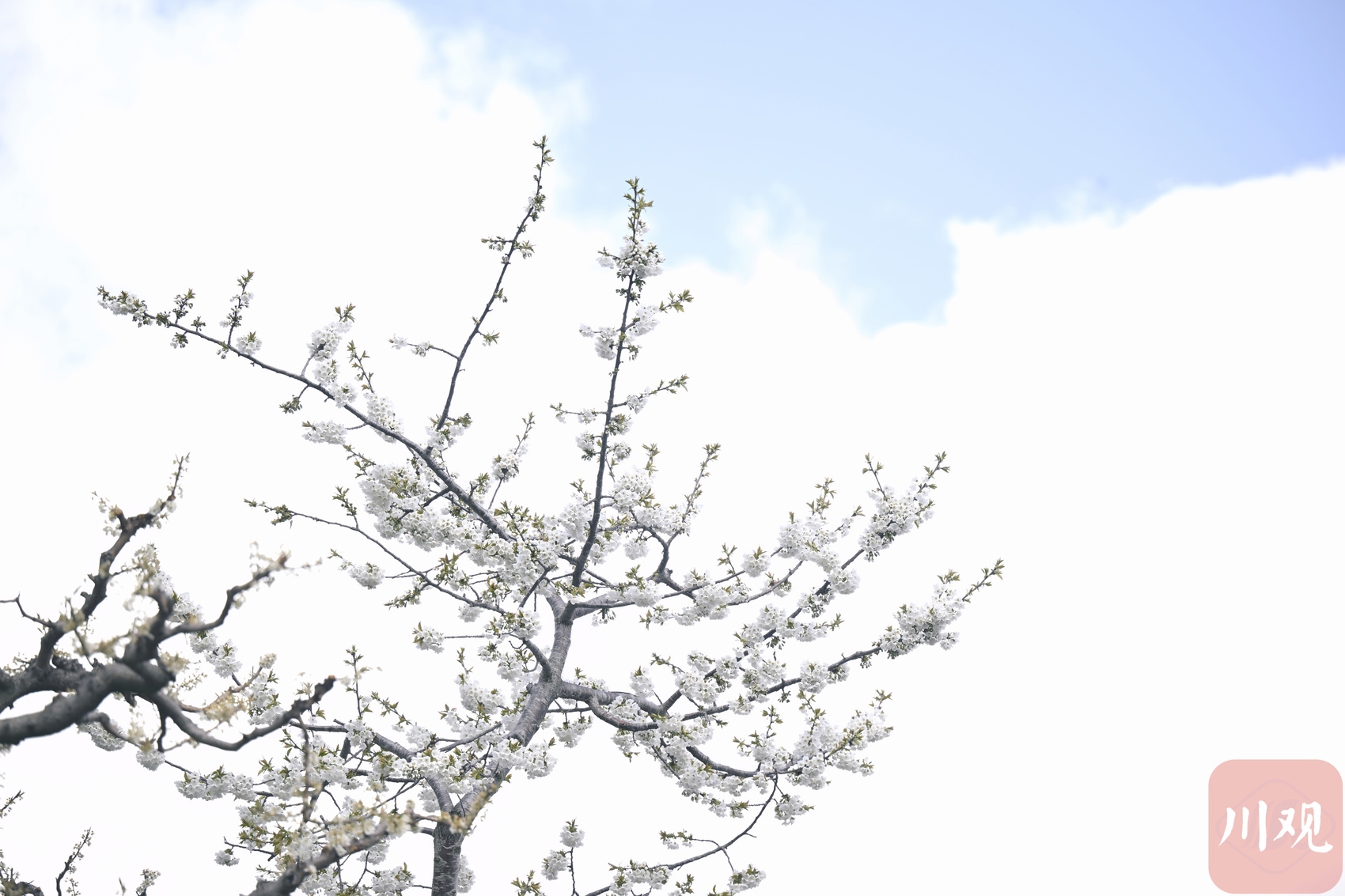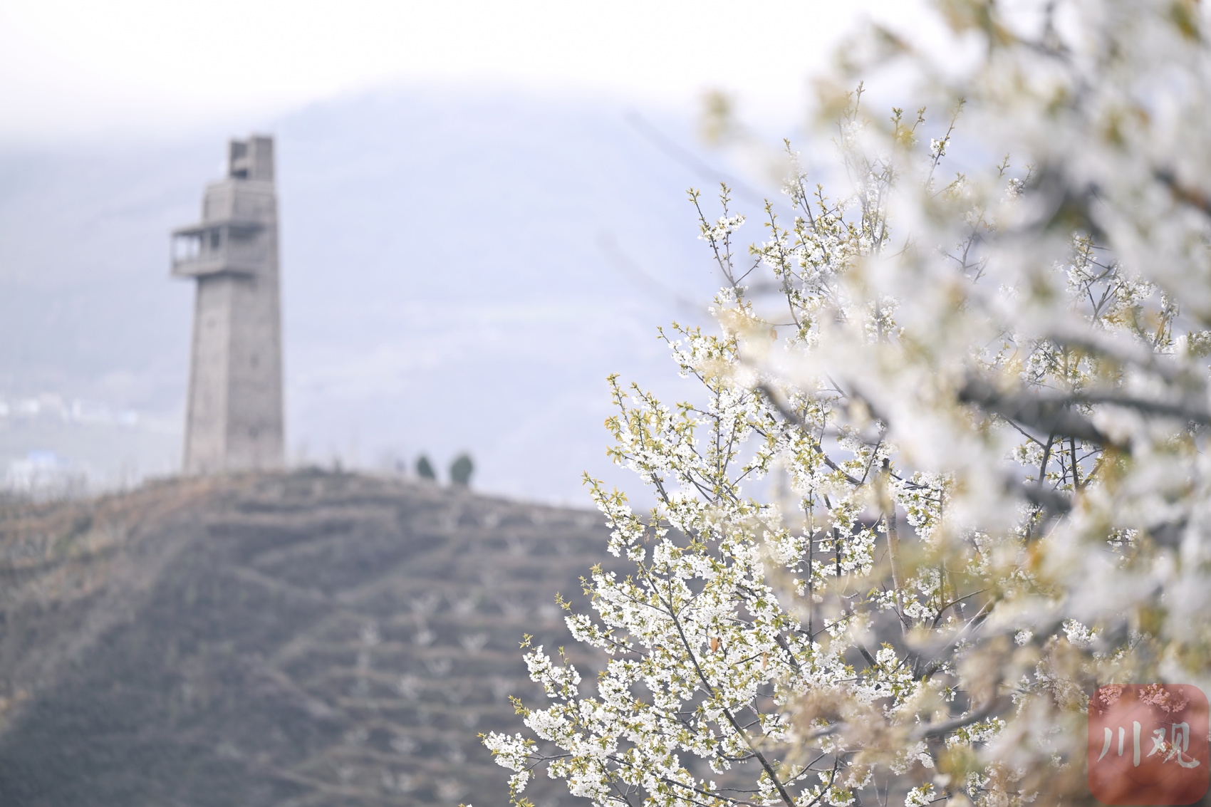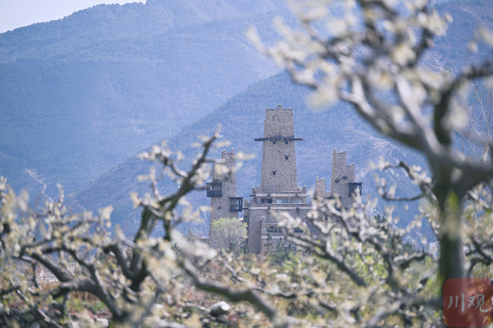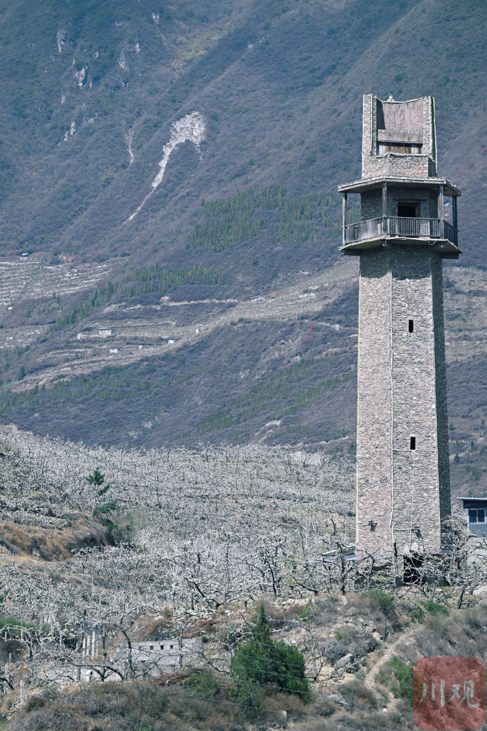 茂县李花迎来盛放期,洁白的花朵如云似雪,与远处的碉楼绘就一幅生态画卷