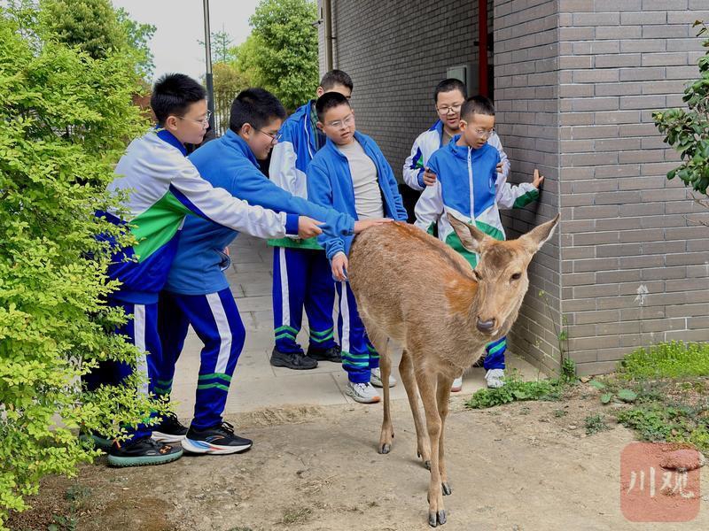 学生们与 “校宠” 梅花鹿温馨互动,和谐相伴。
