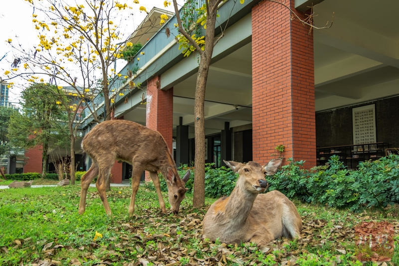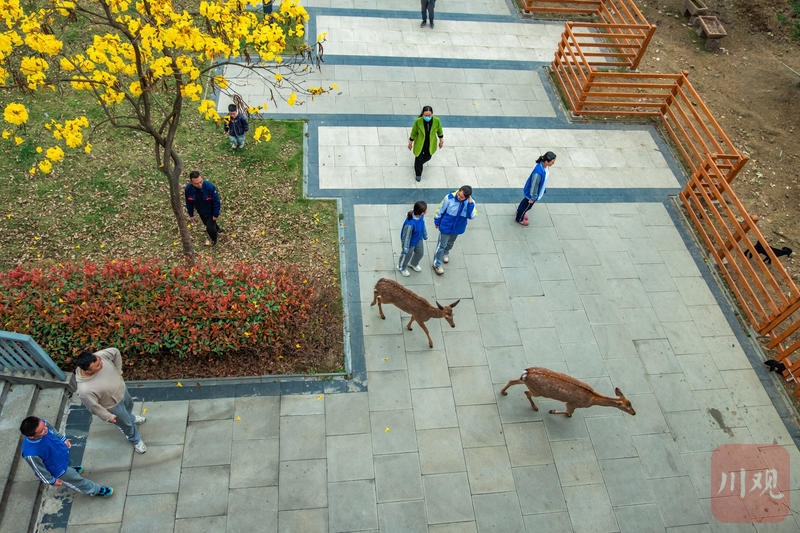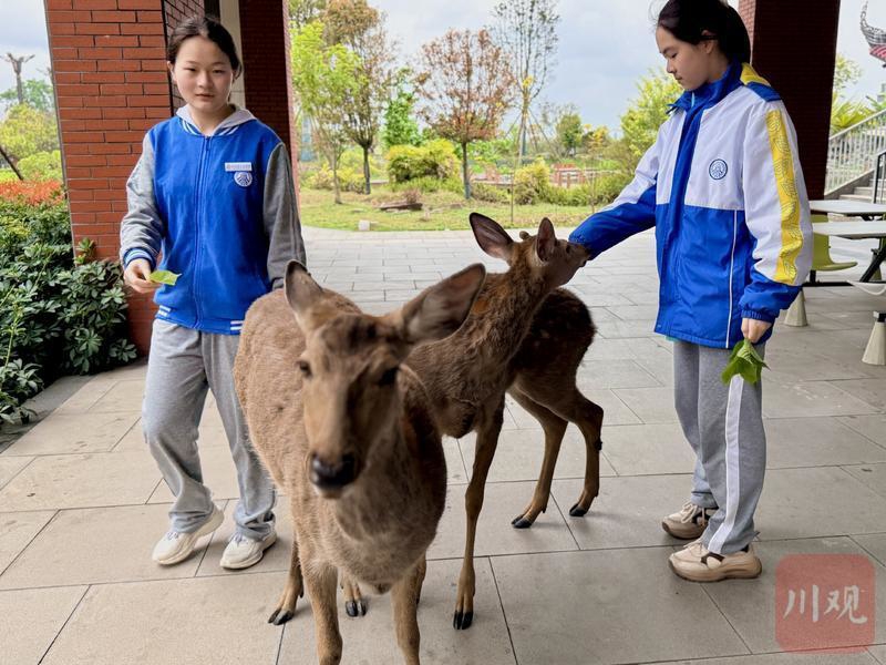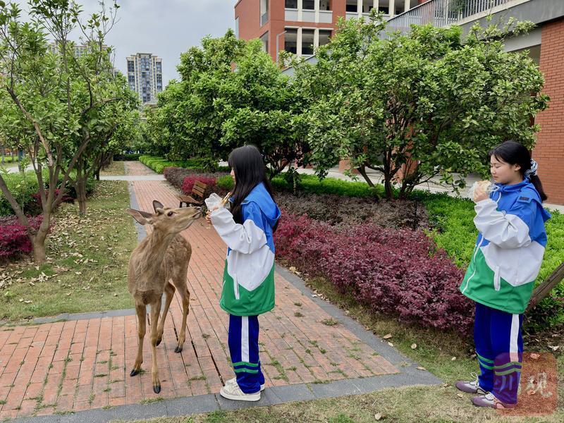 校园学子与 “校宠” 和睦相处,梅花鹿深受师生喜爱。