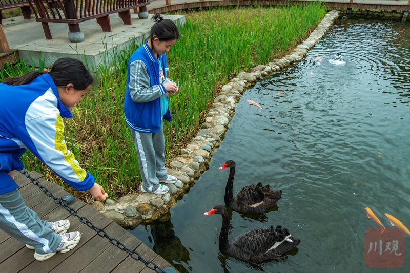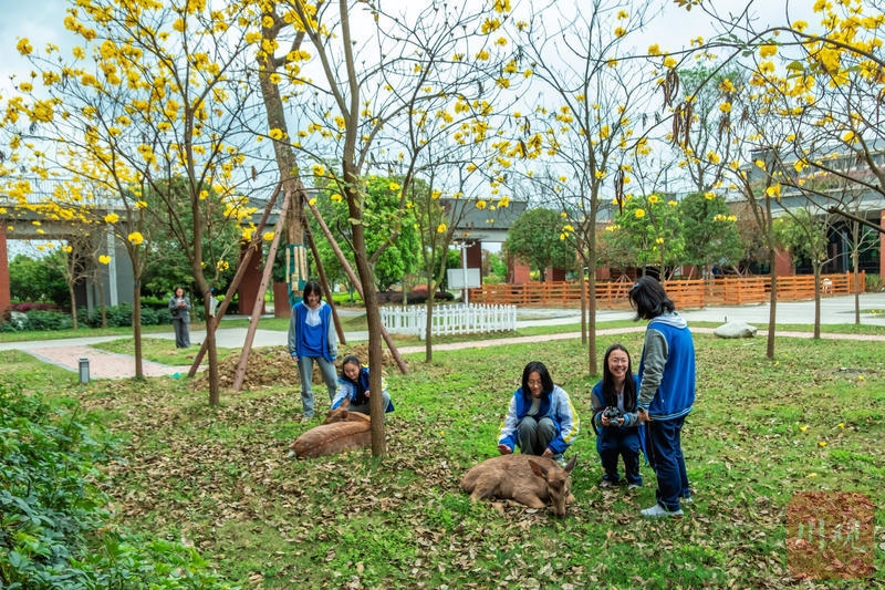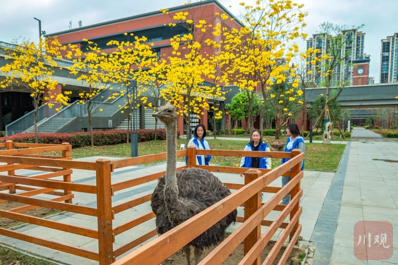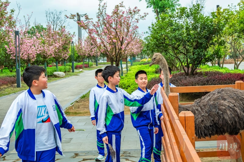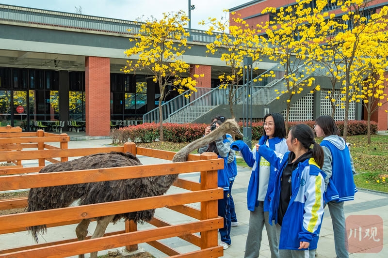 2026年3月29日,四川广汉中学春意融融,梅花鹿、鸵鸟、孔雀、黑天鹅等近20种动物与学子和谐共处,成为校园独有的温情风景。
