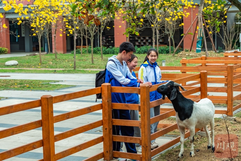 课间课后,学生轻声互动、文明投喂,萌宠成为缓解学业压力的暖心伙伴。学校以场景育人理念打造生态校园,让学子在亲近自然中学会尊重生命、涵养爱心,构建起充满生机与温情的育人环境。