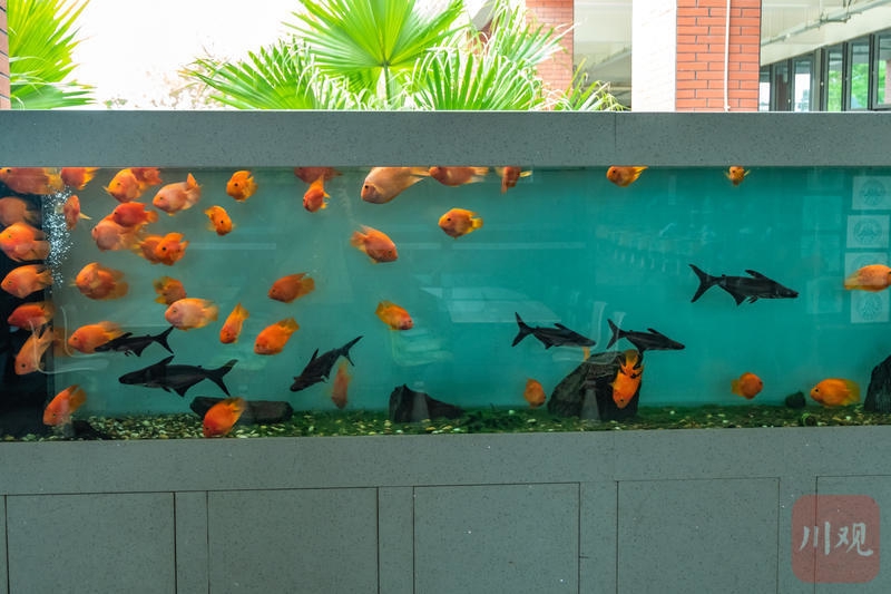 校园鱼缸内各色鱼类畅游,为校园增添生机。