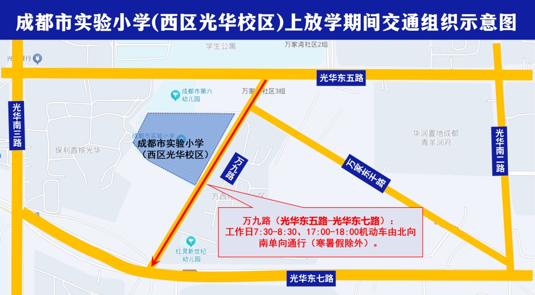 四、青羊区万九路(光华东五路至光华东七路)实施工作日每天7:30至8:30,17:00至18:00(寒暑假期间除外)机动车由北向南单向通行的交通组织。受限车辆通过光华东七路、光华南三路、光华东五路等道路绕行。