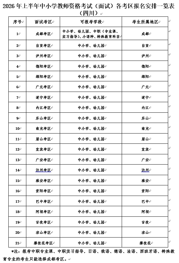 网上报名时间:2026年4月17日10:00至4月20日17:00;注意,中职专业课、中职实习指导,日语、俄语、德语、法语、西班牙语和特殊教育科目,只能选择成都考区报考。