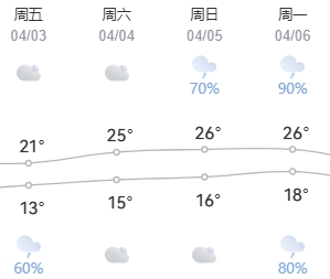据气象部门初步预测,今年清明假期前一天(4月3日,星期五)和清明假期(4月4日至6日)成都市将以多云及阴天为主,间有零星小雨,气温13~26℃,整体适宜假日出游,将进一步促进市民、游客踏春赏花短途出行需求。