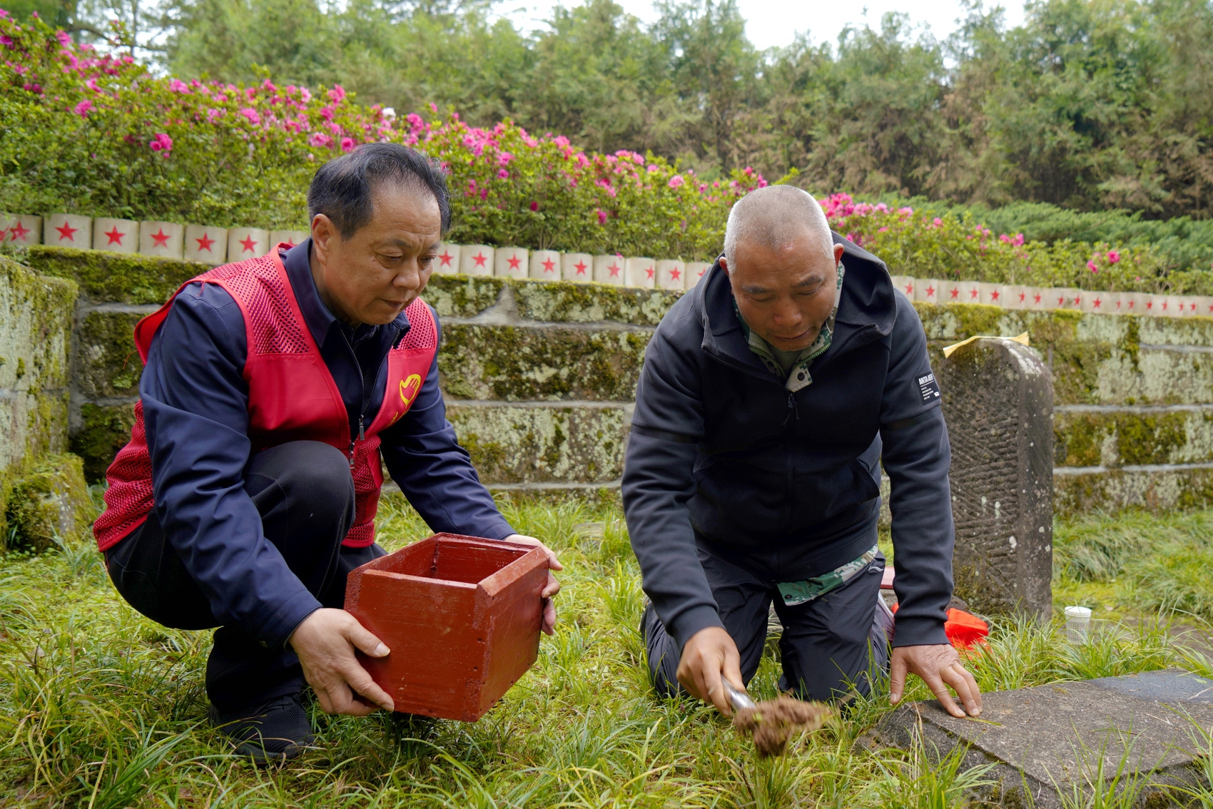 3月31日,在四川省巴中市通江县川陕革命根据地红军烈士陵园,烈士张泽艳的侄儿张克争,俯身取下一撮张泽艳烈士墓土,小心翼翼地收进随身携带的容器中。胡鹏 摄