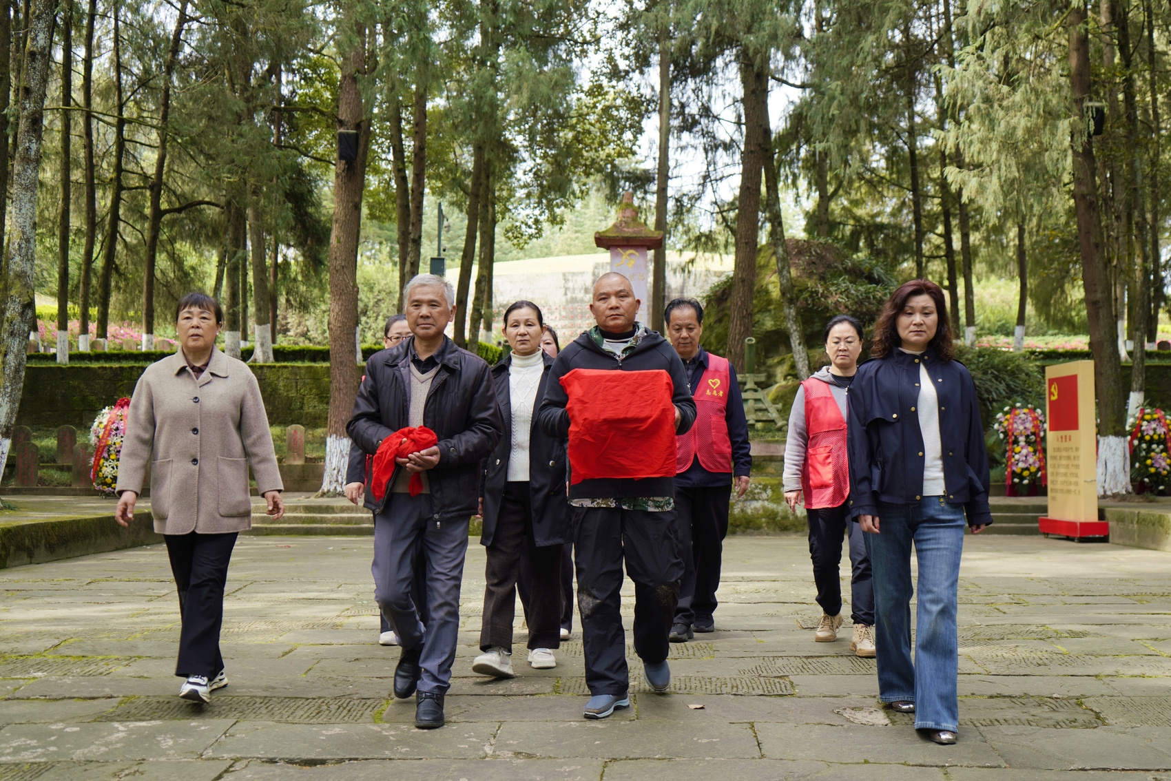 3月31日,在四川省巴中市通江县川陕革命根据地红军烈士陵园,烈士张泽艳、王德清的亲属,带着从烈士墓前取来的墓土,踏上返程之路。胡鹏 摄