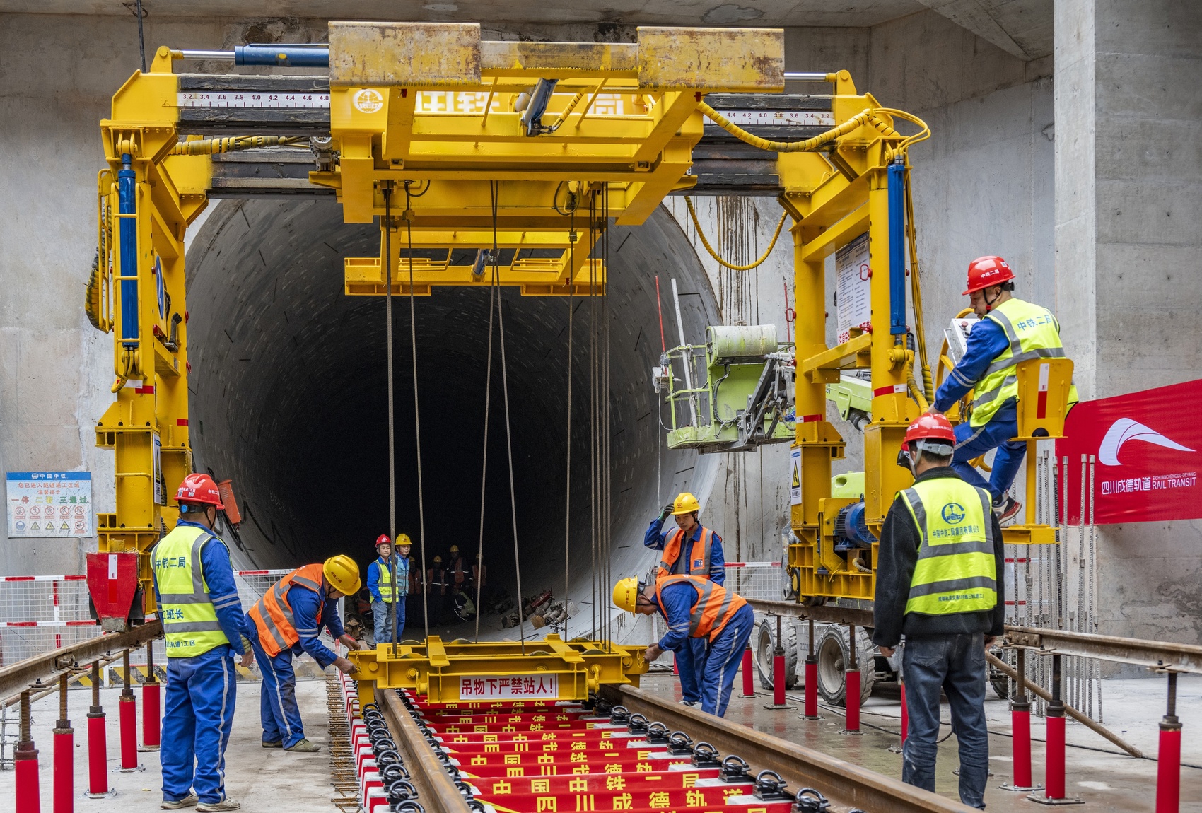 第一节轨排于3月30日铺设完成。当天下午,成德线南端韦家碾站铺轨基地,一辆铺轨小车吊着一节25米长的轨排,缓缓从地面吊下。轨排精准落在轨枕上,螺栓孔位严丝合缝。