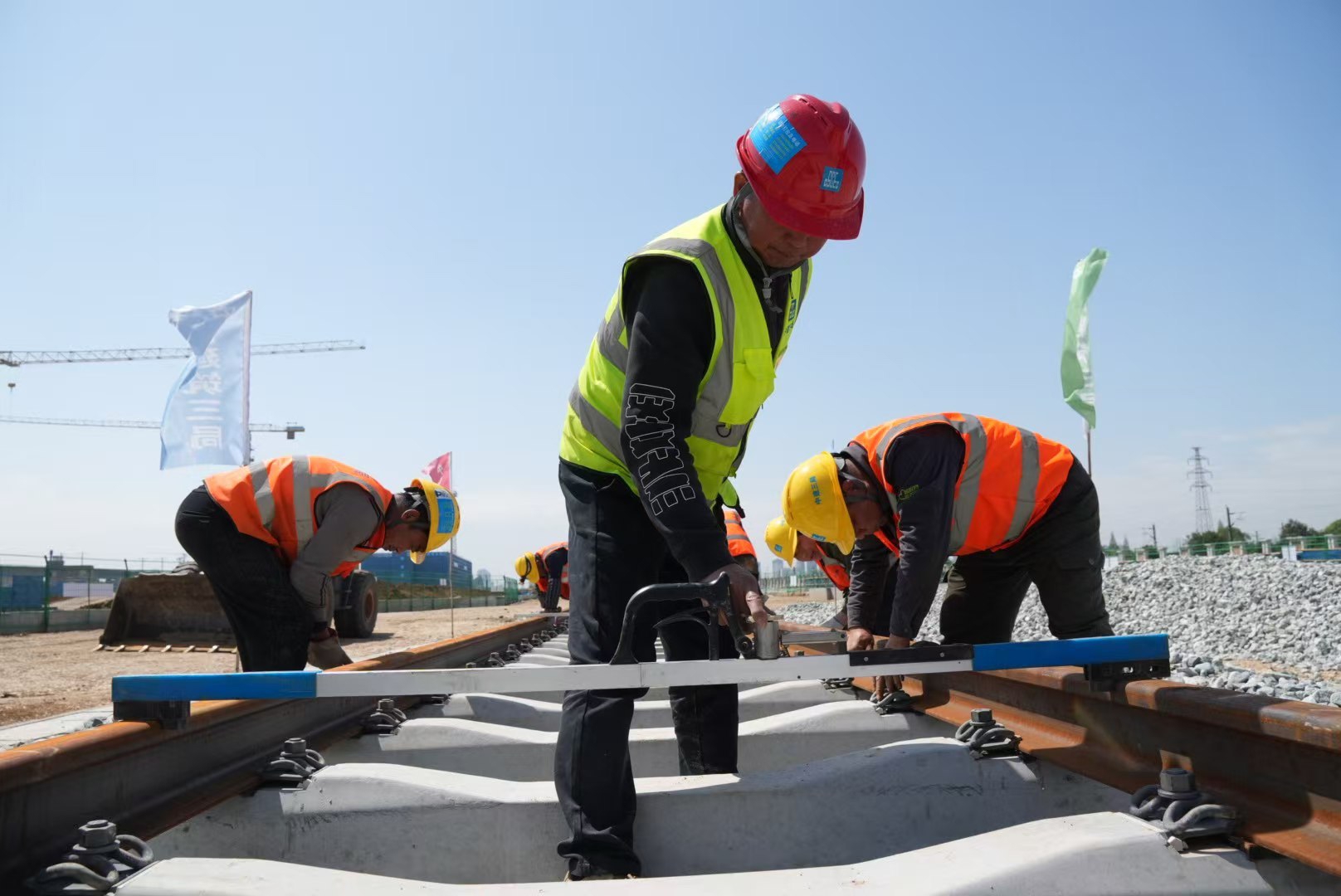 成德线北端德阳北车辆段铺轨基地,工人正在铺设轨排。