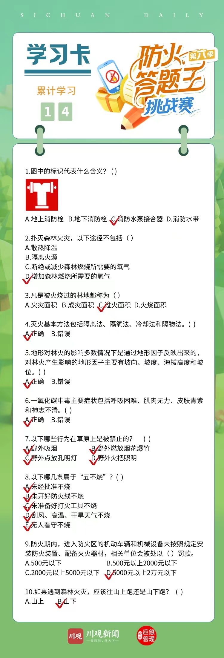 春季防火关键期,森林草原安全无小事!新一期防火“答题王”学习卡上线,一起筑牢防火线。扑灭森林火灾需散热降温、隔离火源、断绝或减少森林燃烧所需要的氧气;被火烧过的林地被称为过火面积;灭火方法有隔离法、隔氧法、冷却法和隔物法四大基本方法。防火期内,进入防火区的机动车辆和机械设备未按照规定安装防火装置、配备灭火器材,相关单位会被处以5000元以上2万元以下罚款;如遇森林火灾要向山下跑,牢记防火知识,践行防火责任,共守绿水青山!