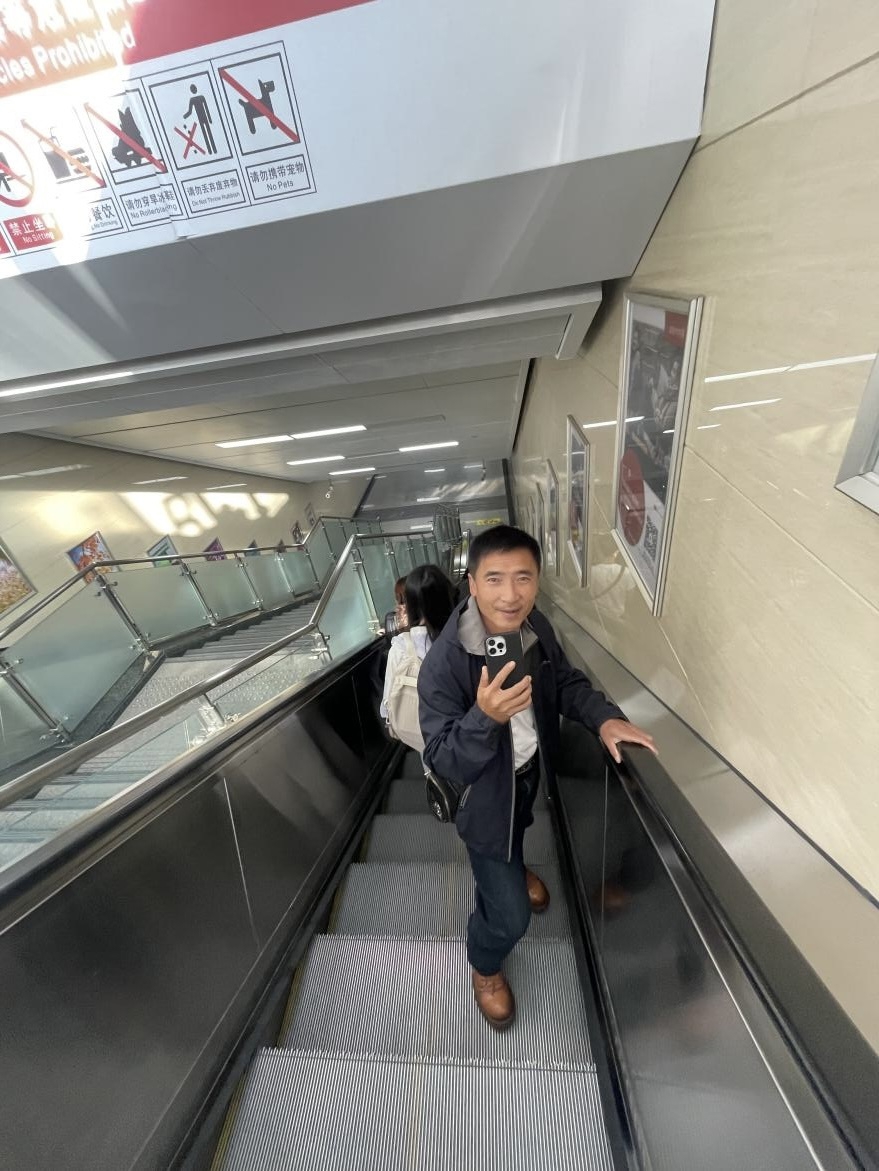 圆形的光点、机舱内椭圆形的窗户、地铁站的扶梯……他的镜头里,多是空间、线条、圆形。在上百张实时更新的图片里,最多的人像是爸爸——戴着黄色帽子的爸爸、正在拍他的爸爸。轩轩会拿着手机,放大看爸爸的表情。