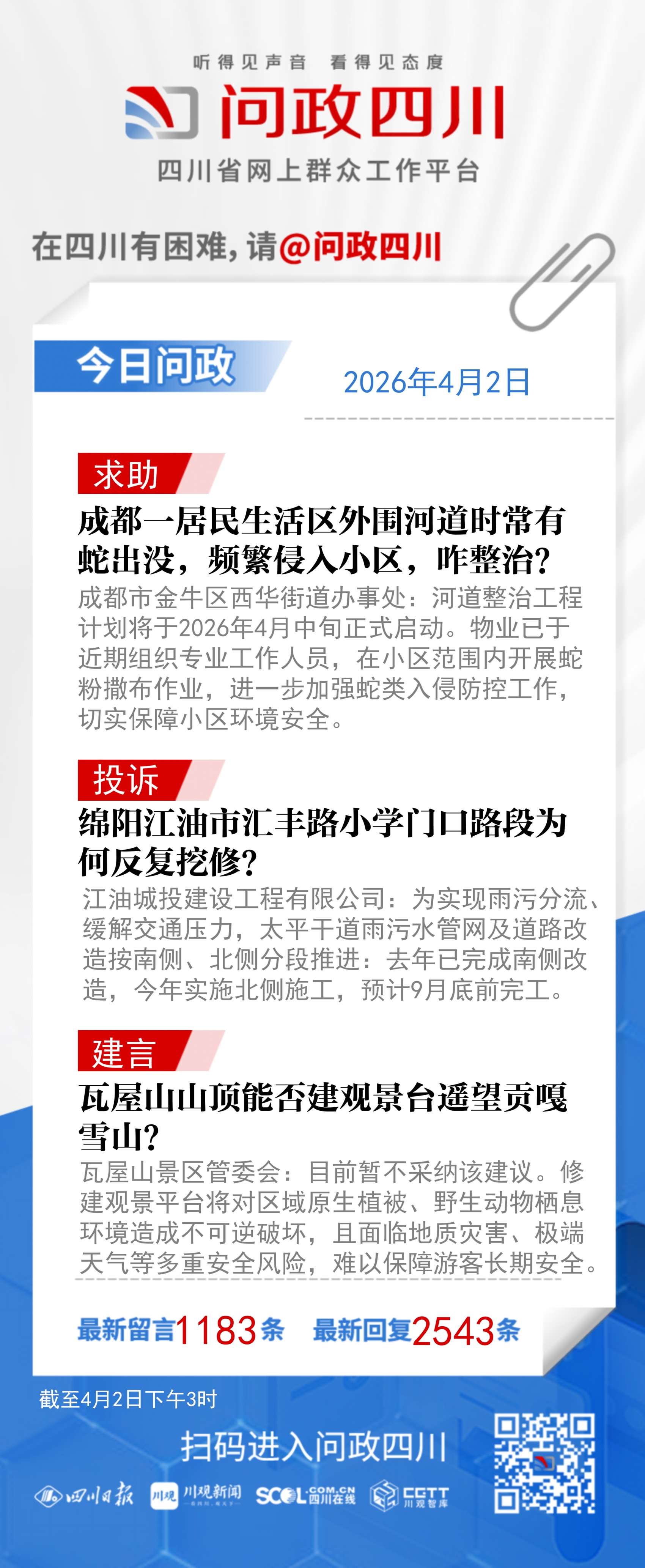 在四川有困难,找问政四川。如果您在四川遇到了操心事、烦心事、揪心事,请登录“四川省网上群众工作平台—问政四川”或拨打问政四川热线(028-96001)留言反映、求助或建议。我们将充分发挥平台的互动联系作用及舆论监督功能,第一时间传递民声,推动问题得以及时解决——听得见声音,看得见态度。