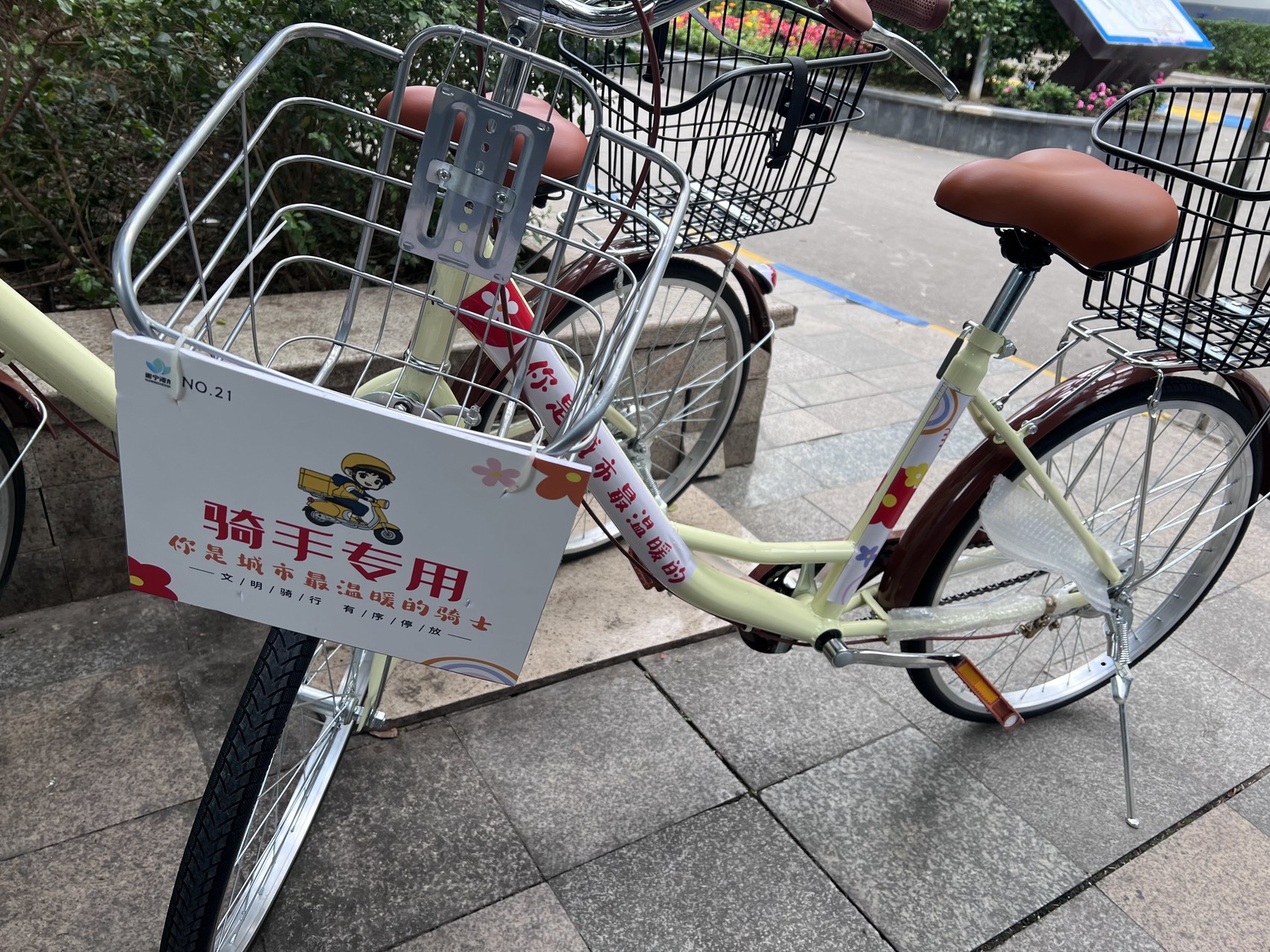 时间来不及,正准备跑步送单的谭桦秋看到小区门口停放着两辆自行车。车身前后安装了置物筐,上面写着“骑手专用”。