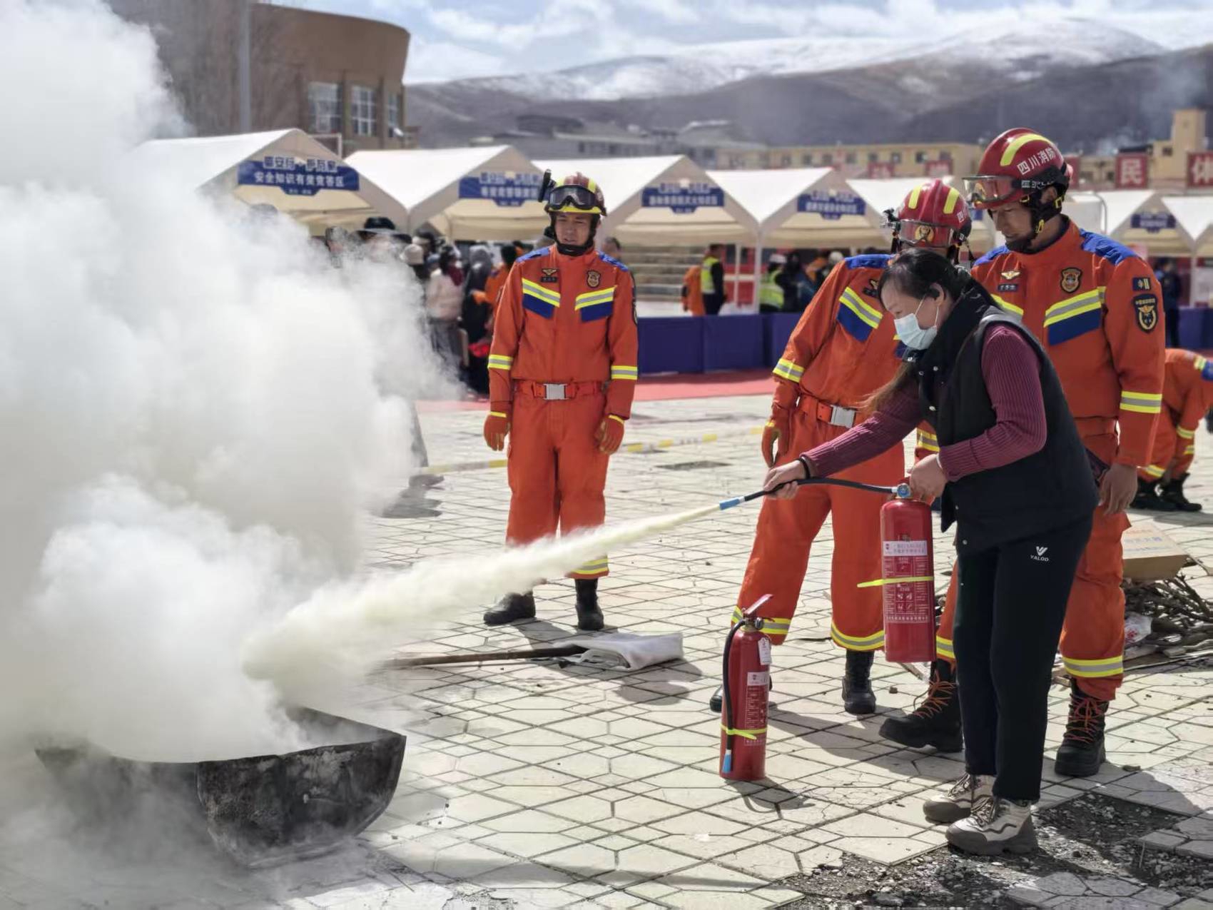 记者看到,阿坝县休闲广场上设置了应急装备展示区和安全科普区,工作人员通过汉藏两种语言,通俗易懂地讲解草原防火知识,展示灭火实操技能,科普牧区道路交通安全的要点,在趣味互动中提升牧民们的应急安全能力。