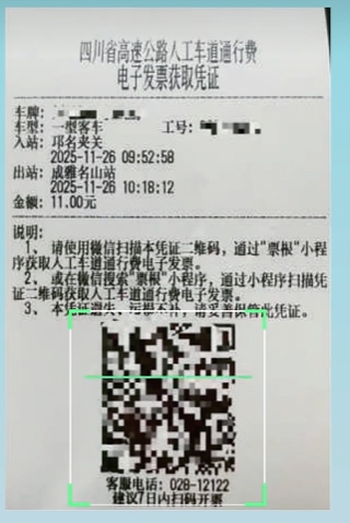 现金支付开票:在缴纳通行费后,纸质发票会被一张印着二维码的小票代替,司机可使用微信扫一扫小票二维码,登录票根App或“e路畅通·票根”小程序,核对通行信息,选择开票抬头,提交开票后7个工作日内开具,发票将推送至邮箱。