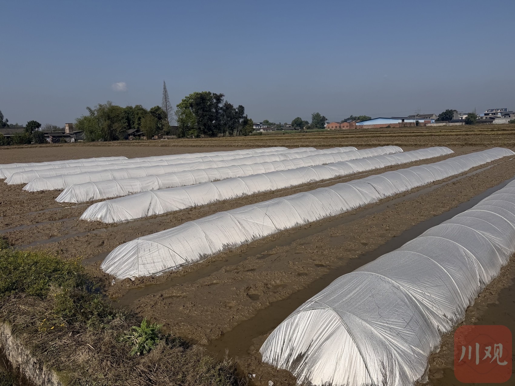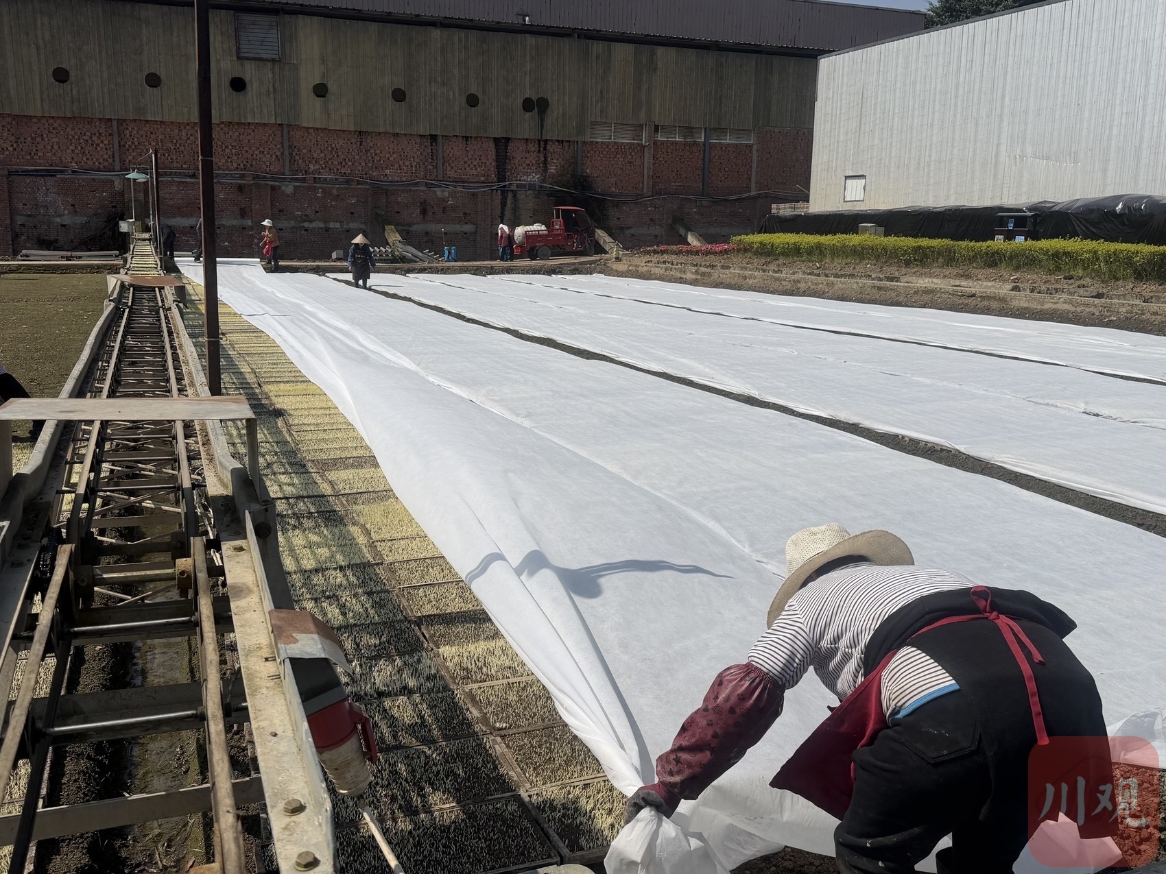 夹江县的乐天农业公司工人正为秧盘盖膜。
