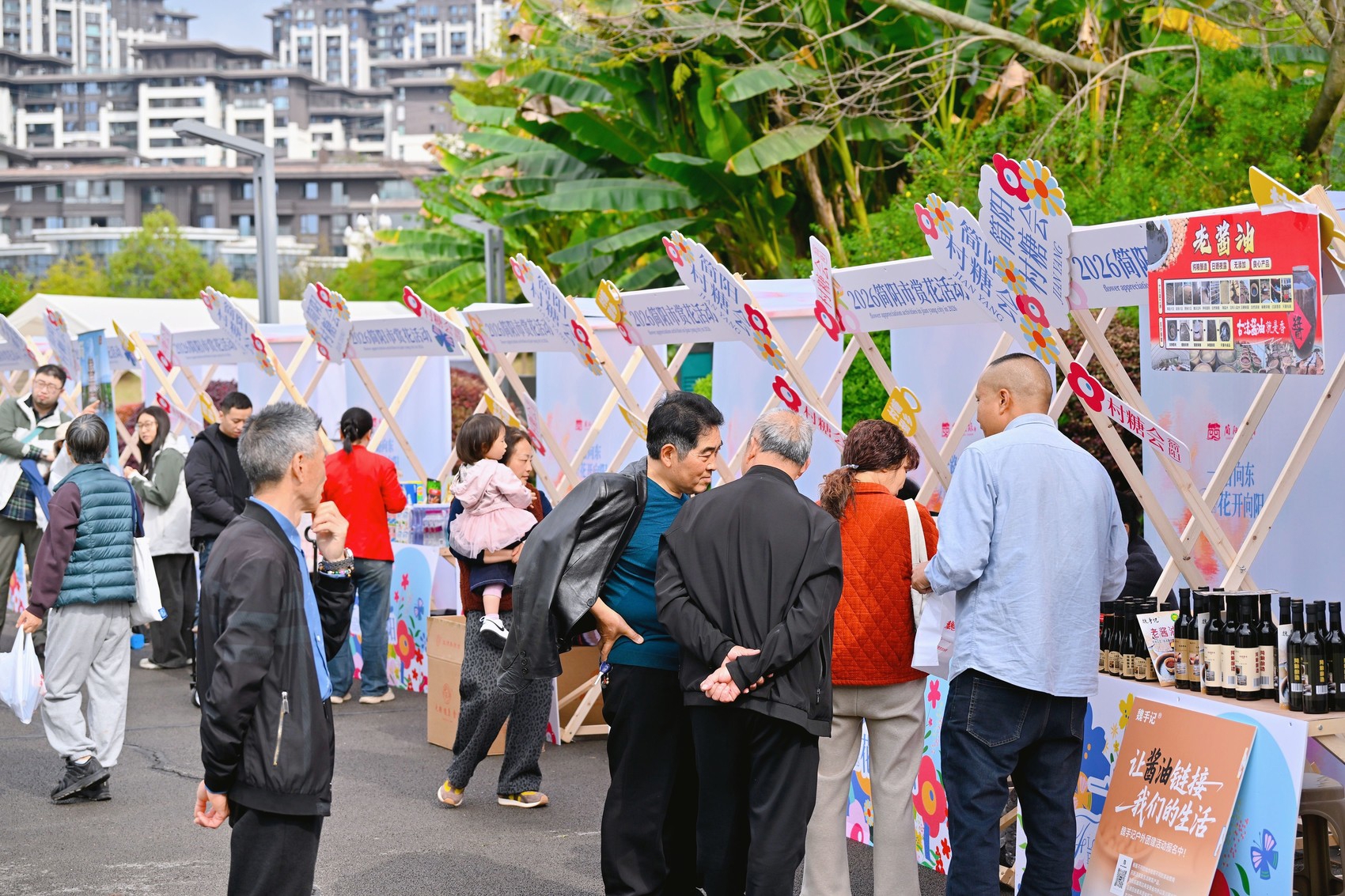 村糖市集同步启幕。钟水饺、蛋烘糕等成都传统名小吃齐聚现场,搭配简阳农特产品与文创好物,构建起“品美食、购好物”的沉浸式消费场景。现场汇聚简阳市本地创业者及非遗代表性传承人,设立非遗手作、花卉主题创意手作及简阳本土文创产品等展位,并配套开展集章游园互动,消费者可凭印章兑换亲子手作体验、花卉文创书签等礼品,丰富市民文化生活、推广本地优质产品。