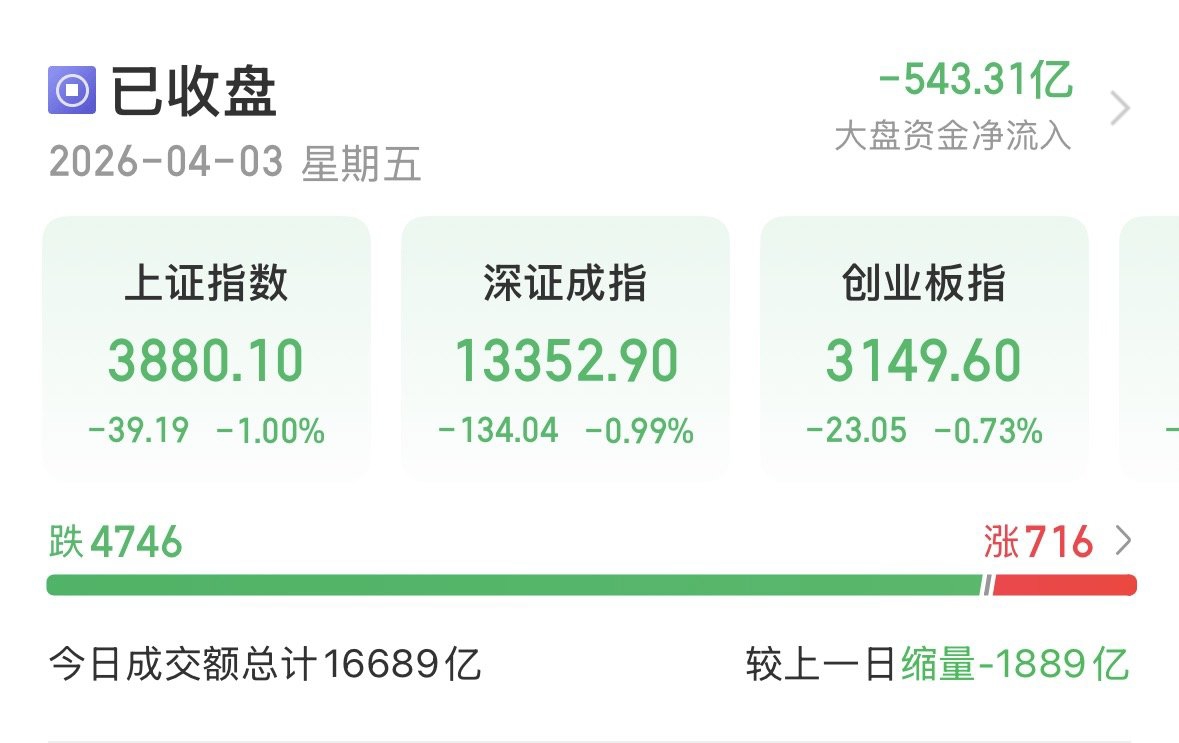 4月3日,A股三大指数集体回调,沪指失守3900点关口。截至收盘,沪指跌1%,收报3880.10点;深证成指跌0.99%,收报13352.90点;创业板指跌0.73%,收报3149.60点。全市场成交额仅有16689亿元,较昨日缩量1889亿元。