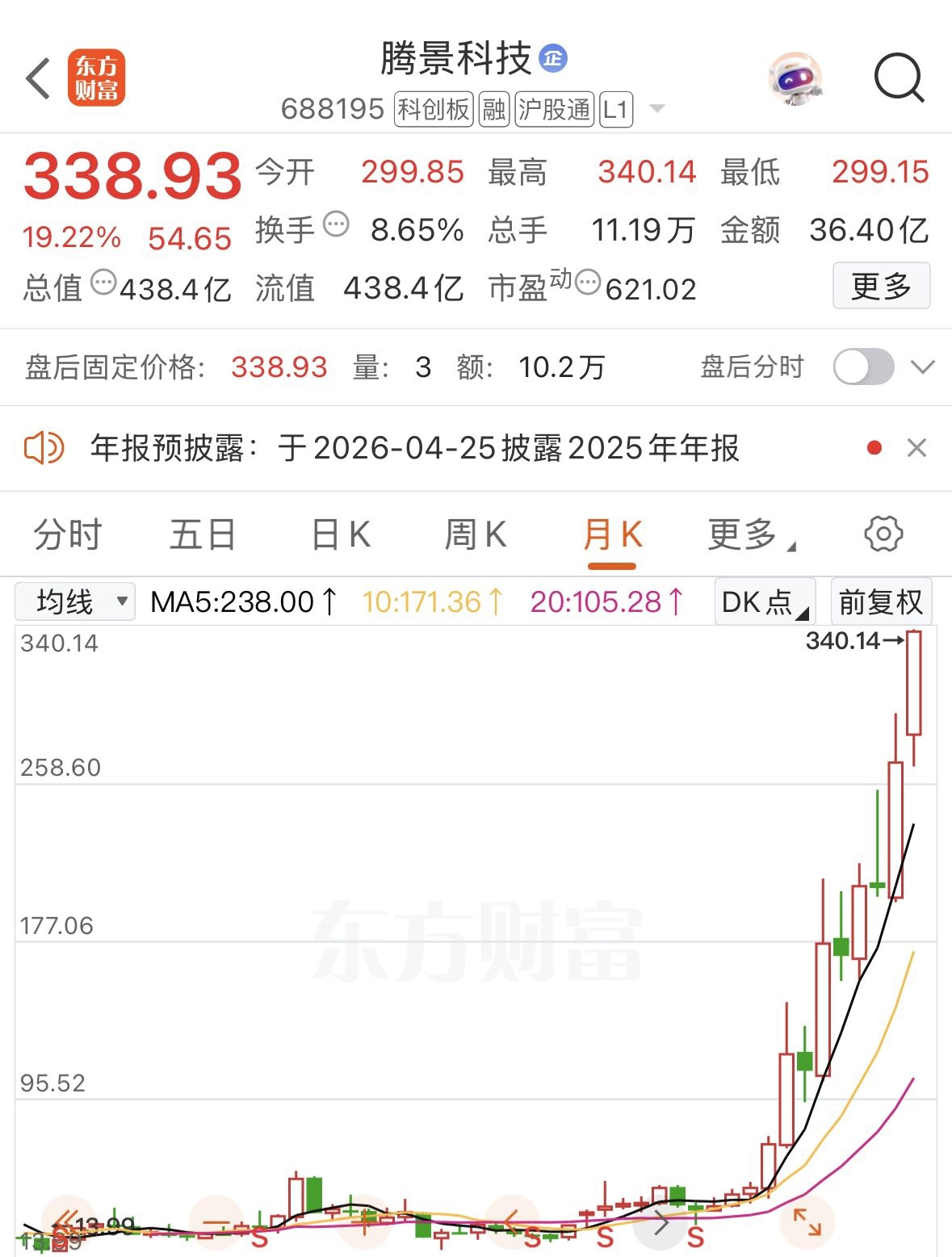 个股方面,腾景科技今天已完成一年十倍股之旅。该股今日盘中最高价超过340元/股,相比2025年4月9日低点最大涨幅超过10倍,截至收盘报338.93元/股。