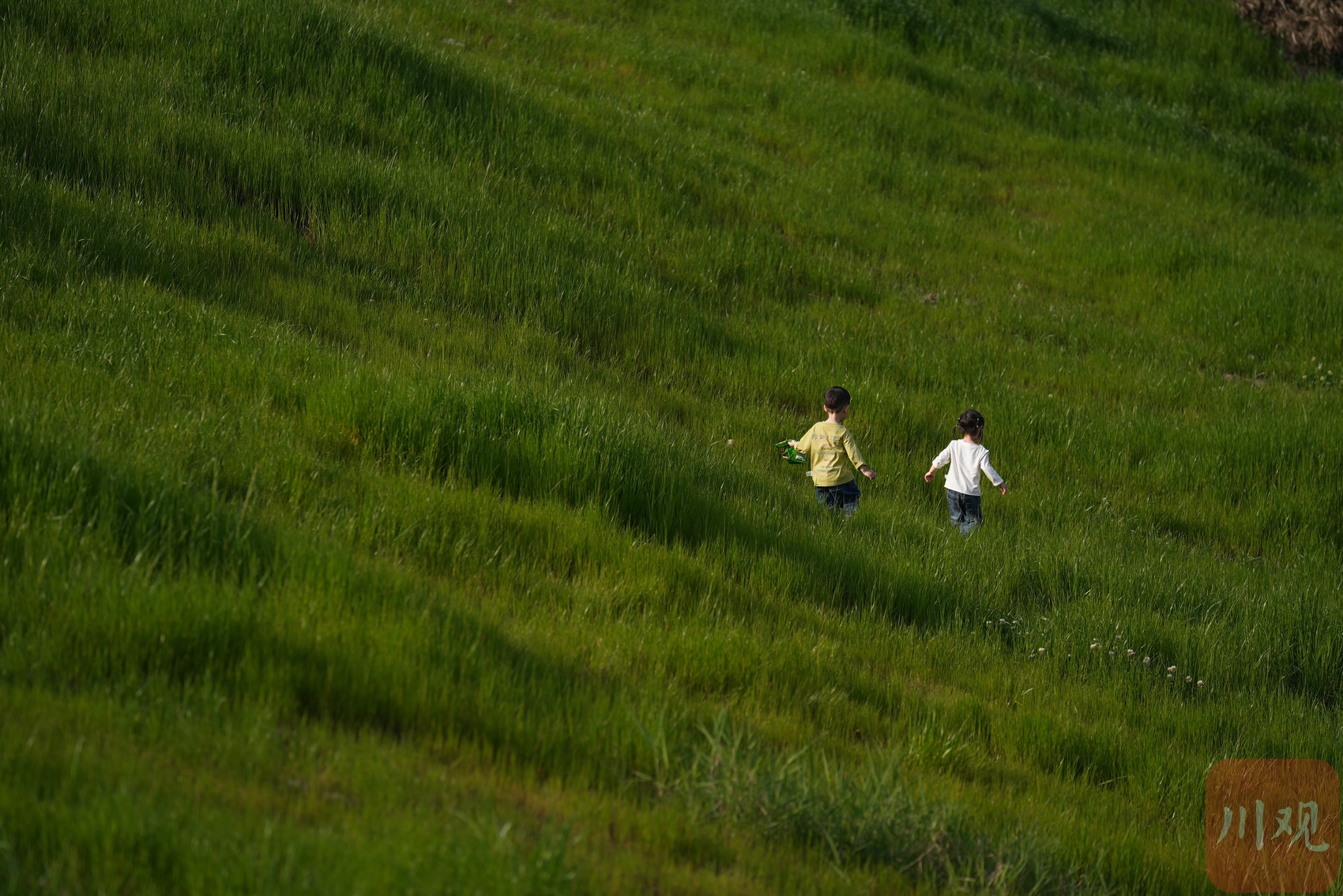 在草地里奔跑的孩童。