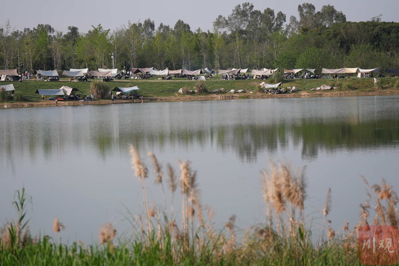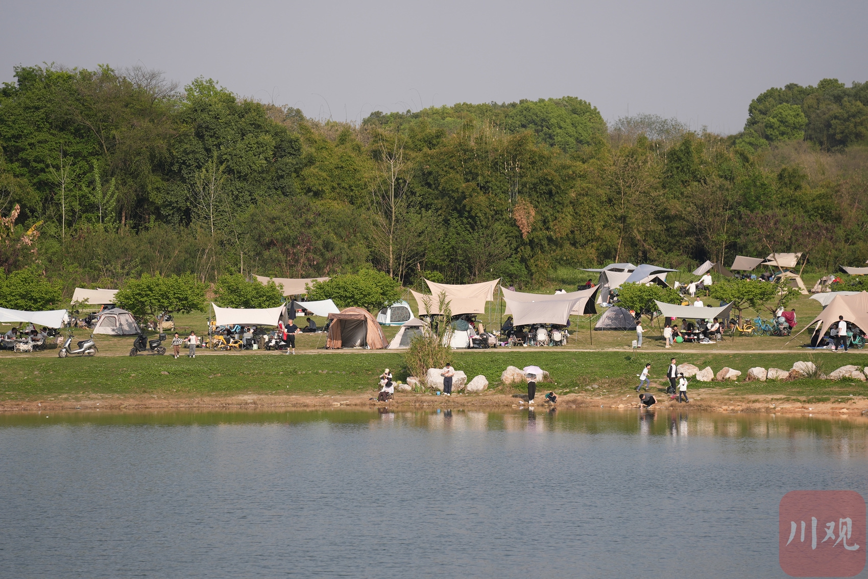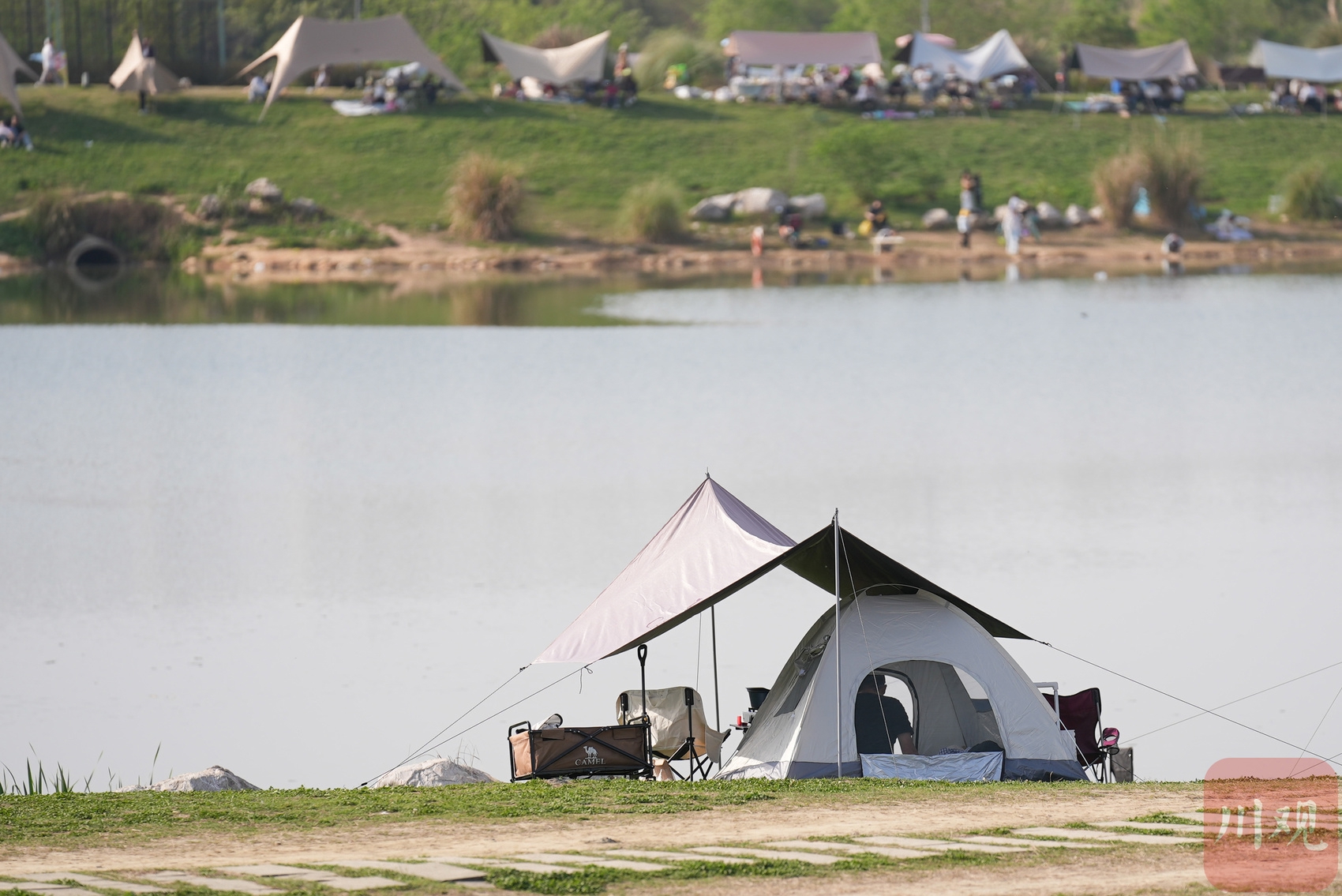 市民把帐篷搭在湖边。