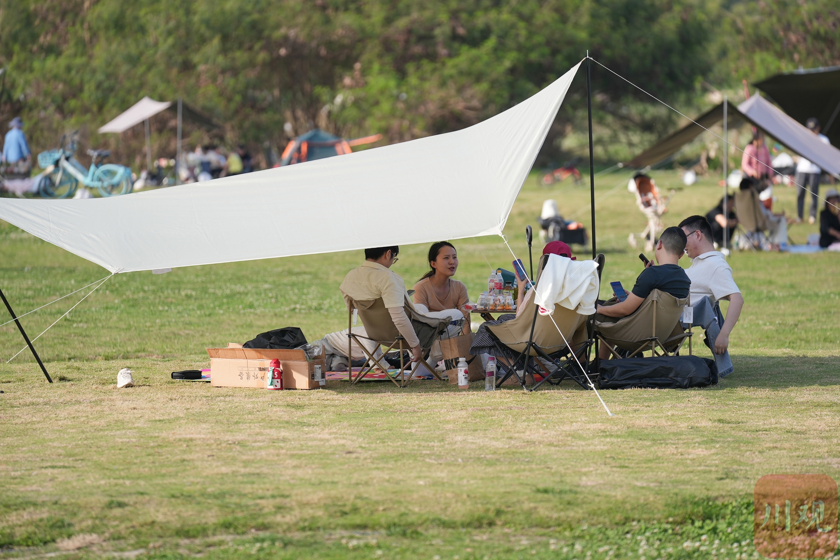 市民在草地露营聊天。