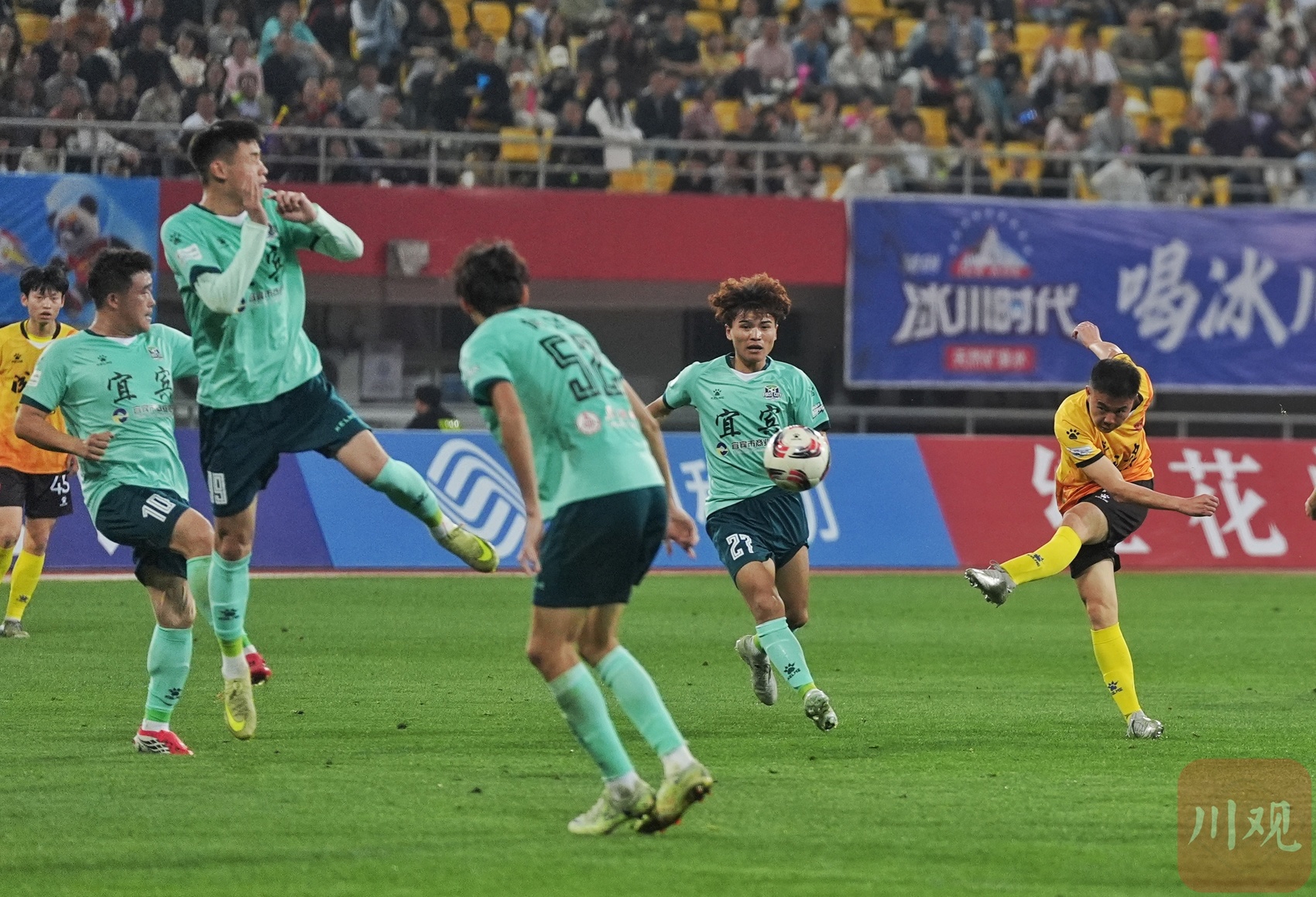 成都锦城队员(黄衣)被对手夹击。。