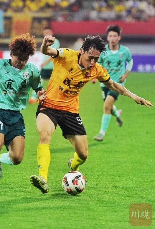 宜宾长江首城队员铲球阻击成都锦城队进攻。