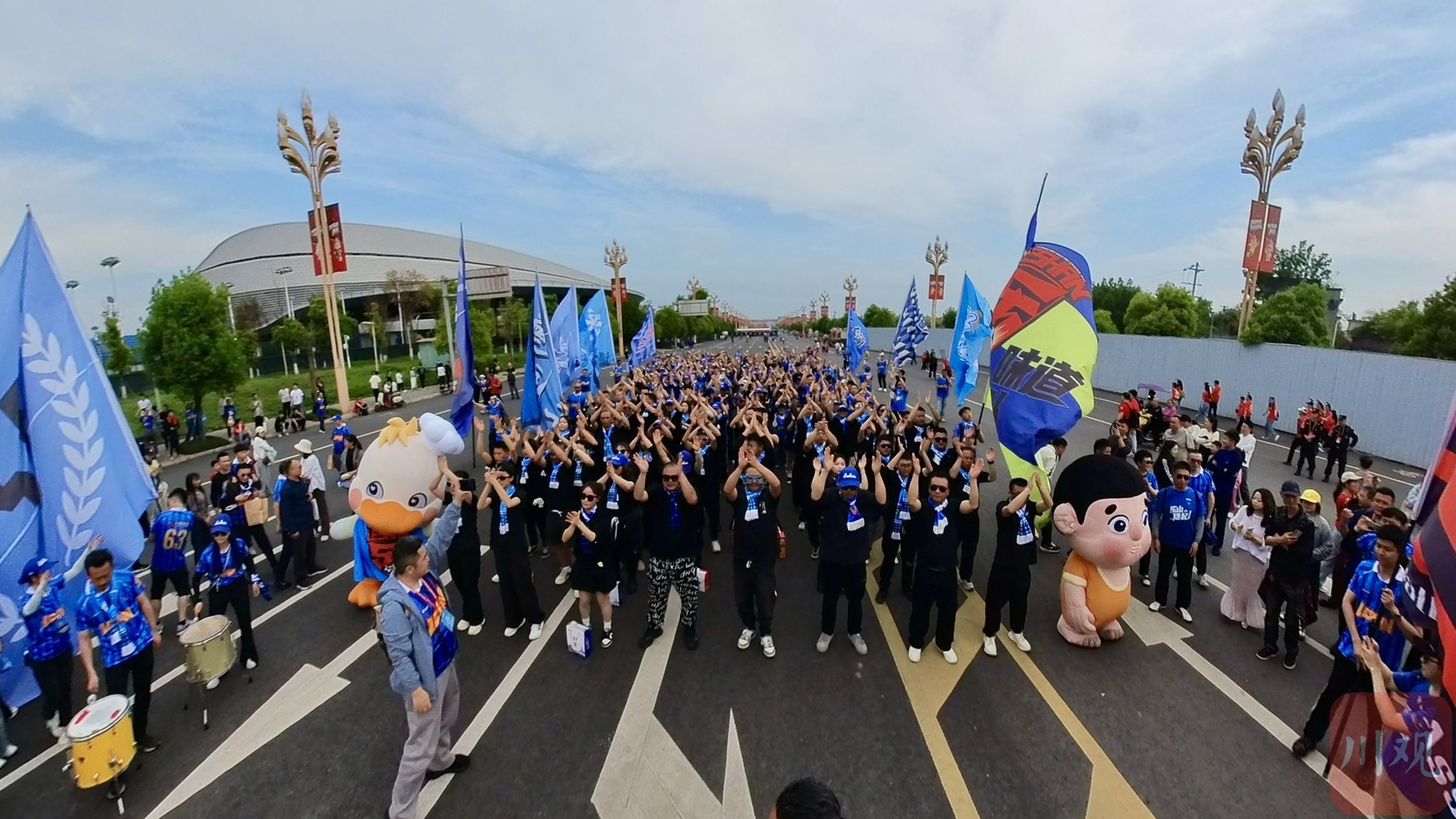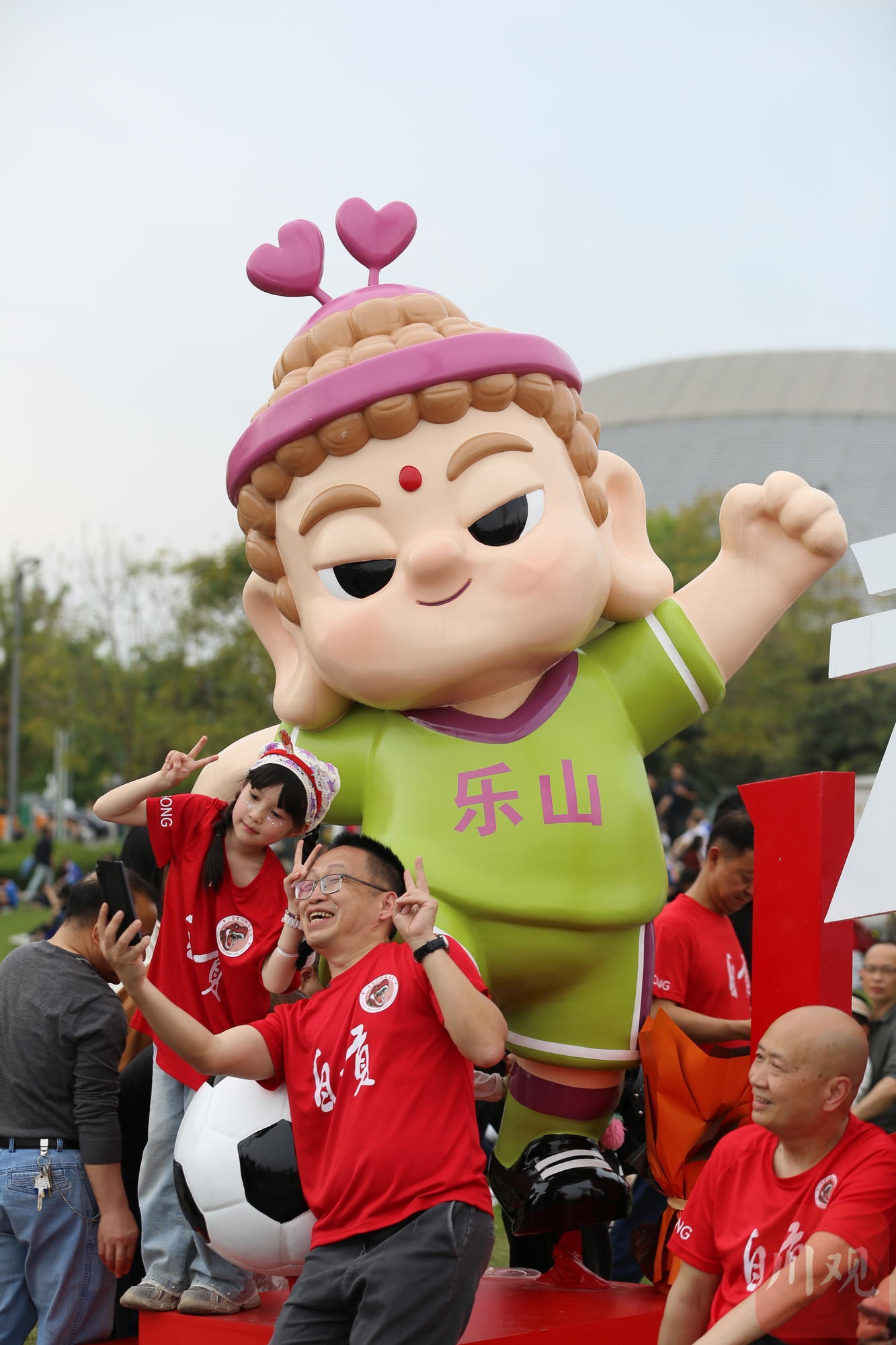 在乐山奥林匹克体育中心场外,自贡灯城燊龙队球迷与乐山大佛玩偶合影拍照。C视觉签约摄影师 李华时 摄