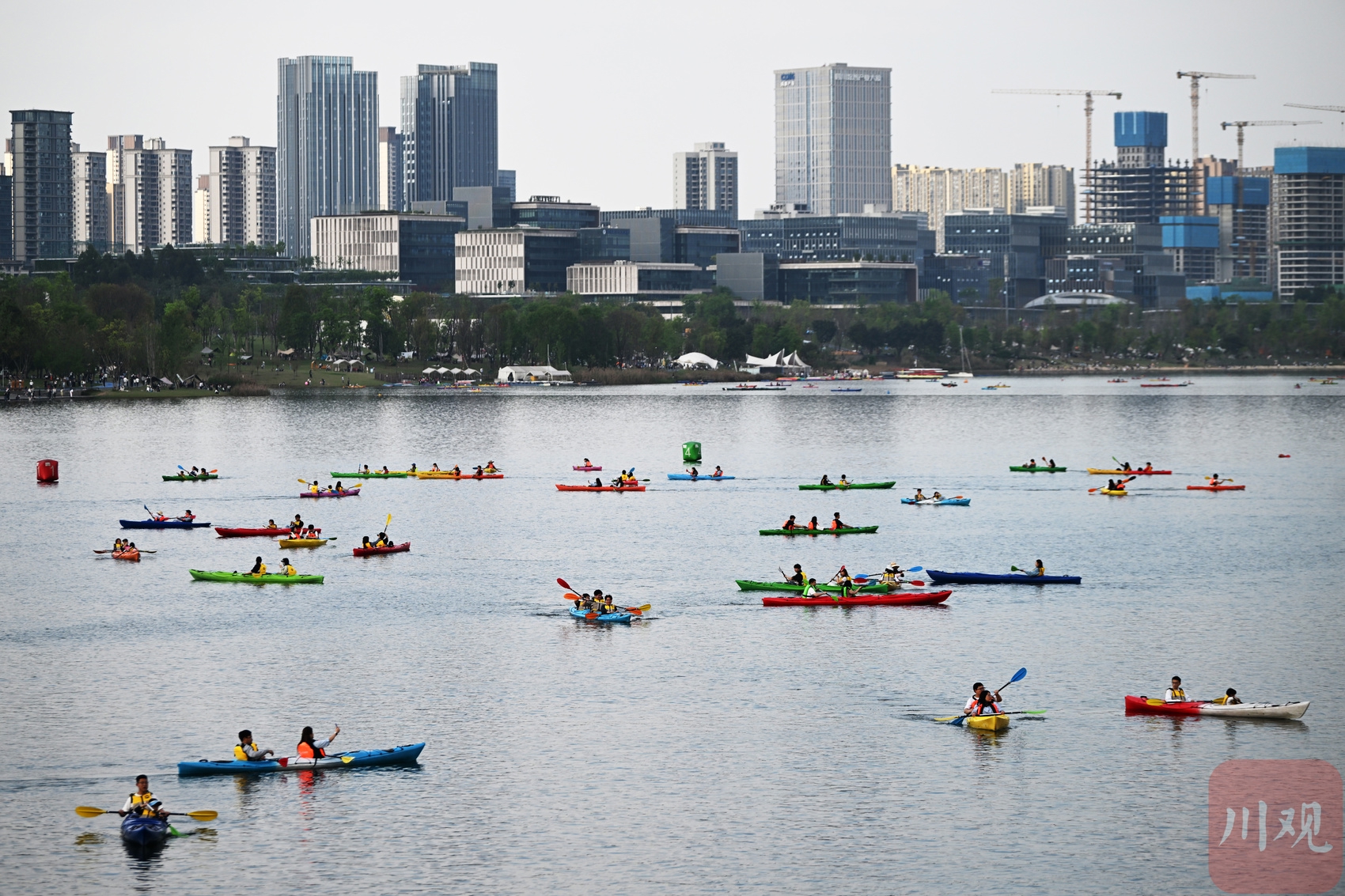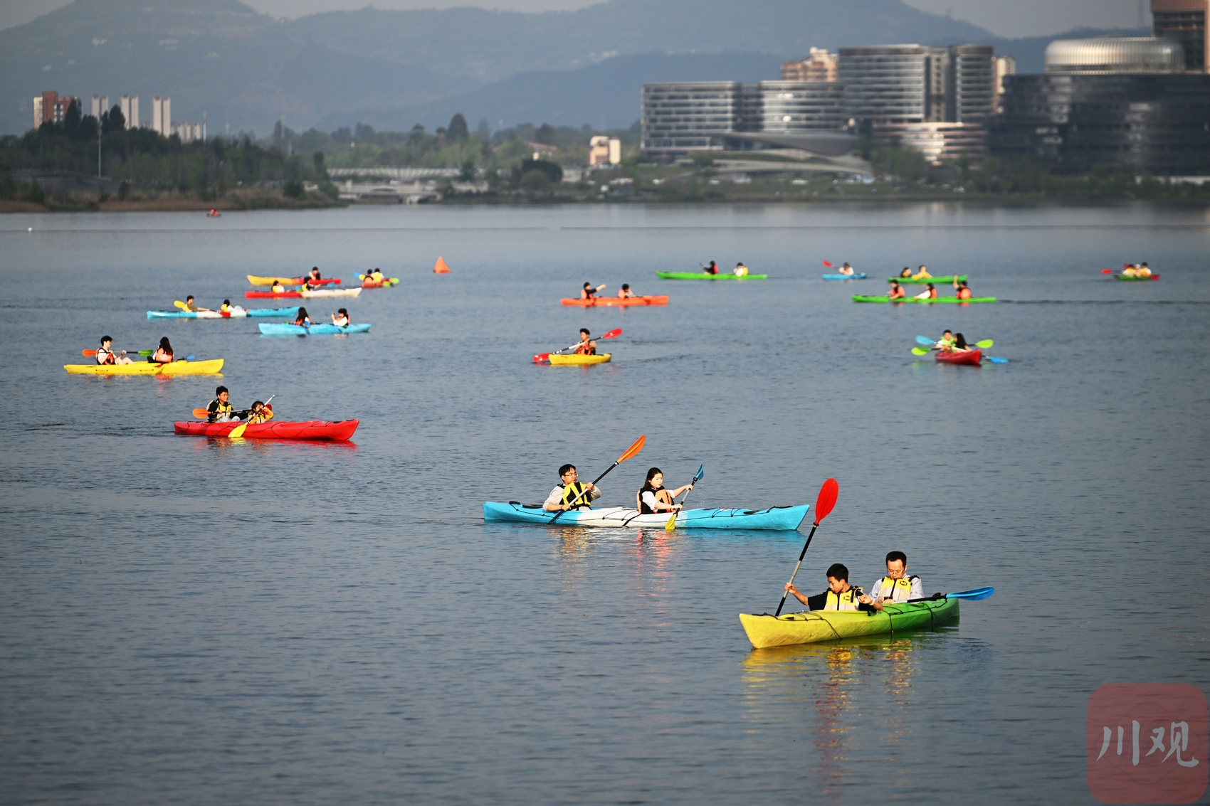 2026年4月4日,游客在四川天府新区兴隆湖体验皮划艇运动。
