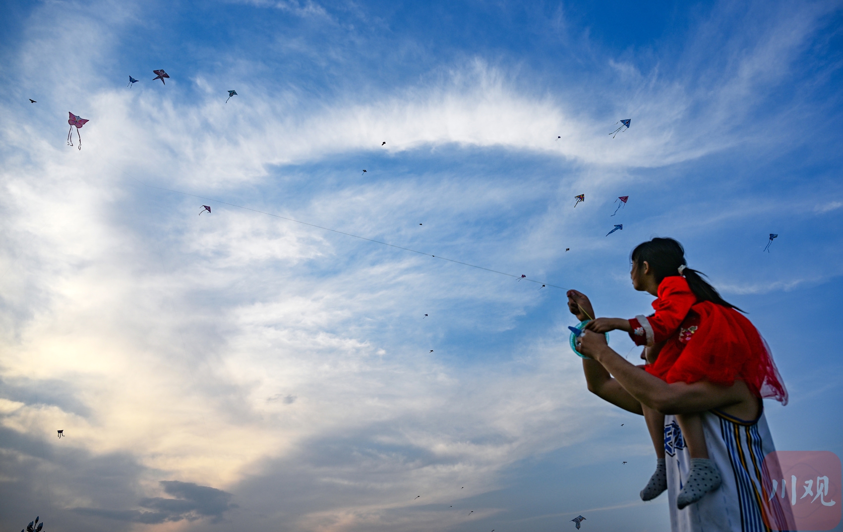 2026年4月4日,父亲陪伴女儿在四川天府新区兴隆湖畔一起放风筝。