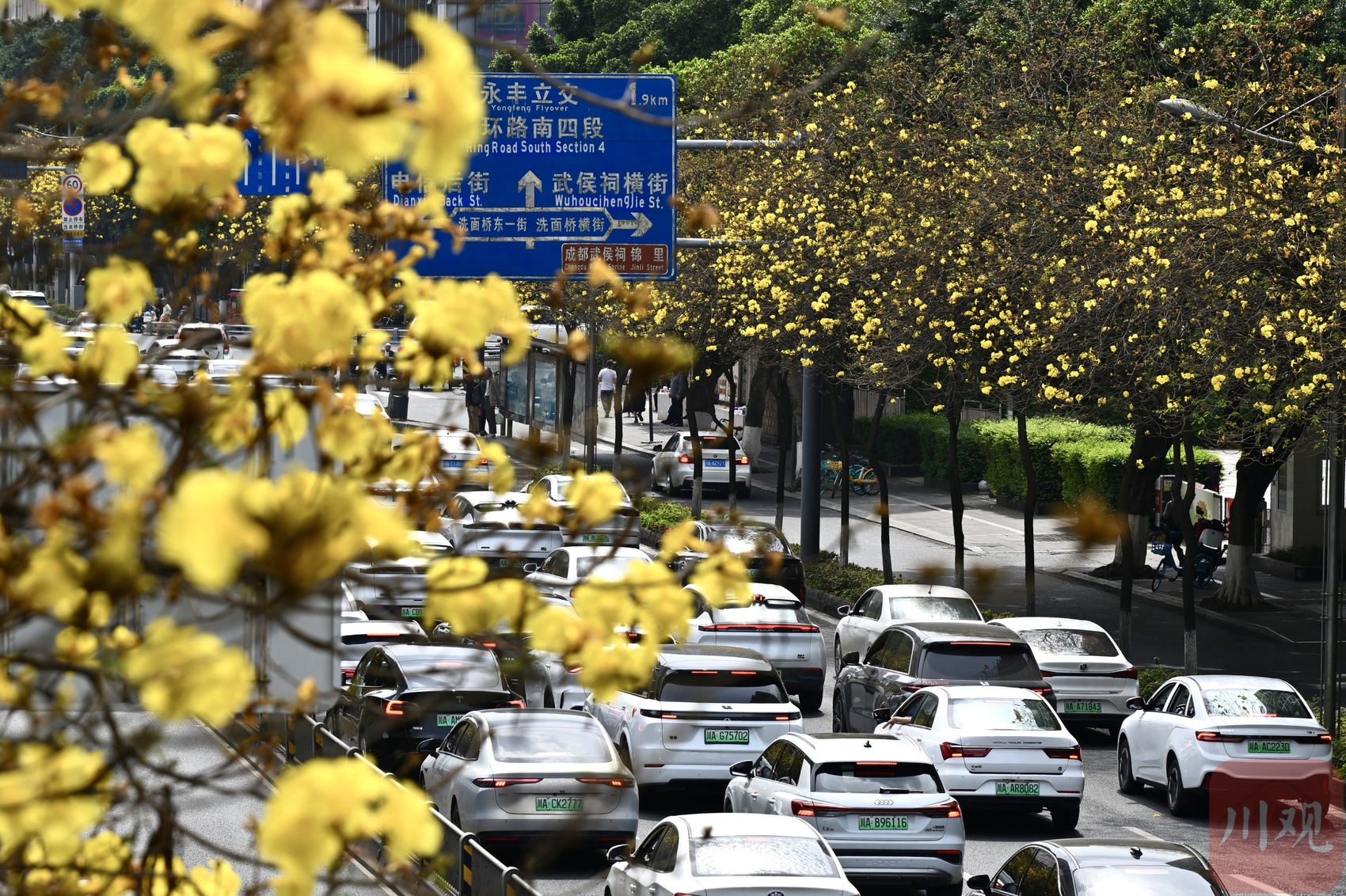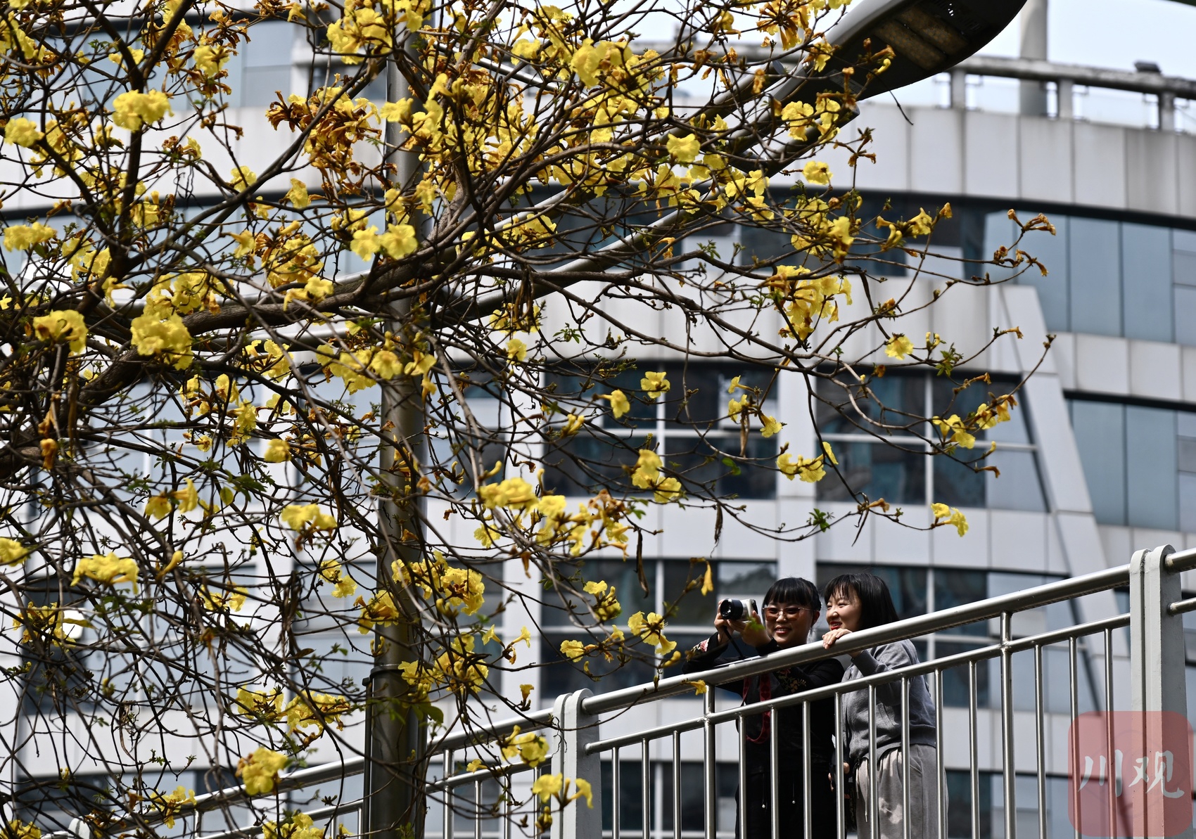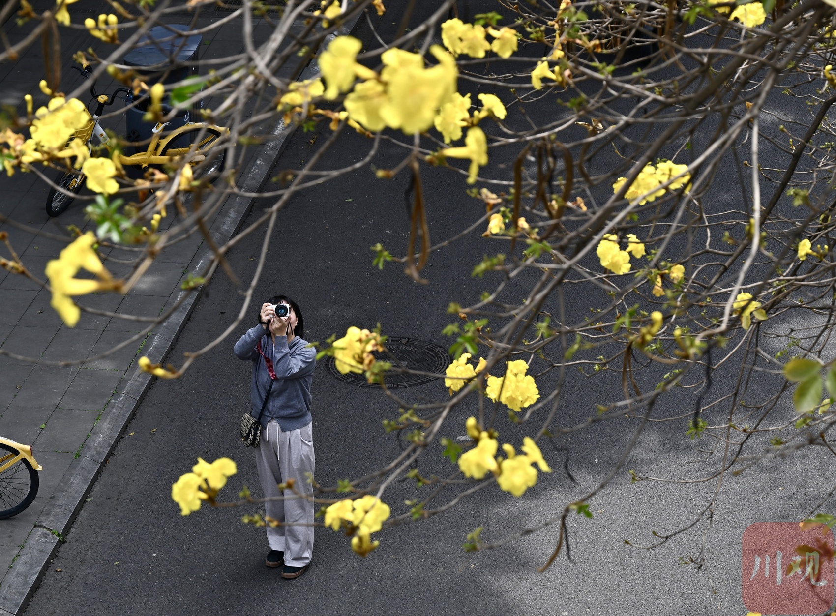 暖阳之下,金黄花簇与城市街景相映成趣,不少市民、游客驻足拍照打卡,定格春日美好。据悉,成都街头的黄花风铃木正处于盛花期尾声,想要打卡的市民和游客需抓紧时间。
