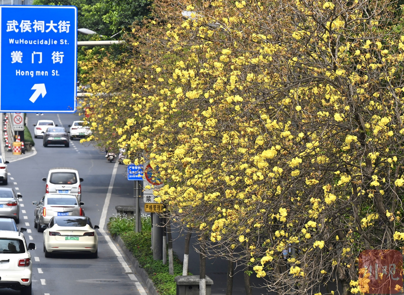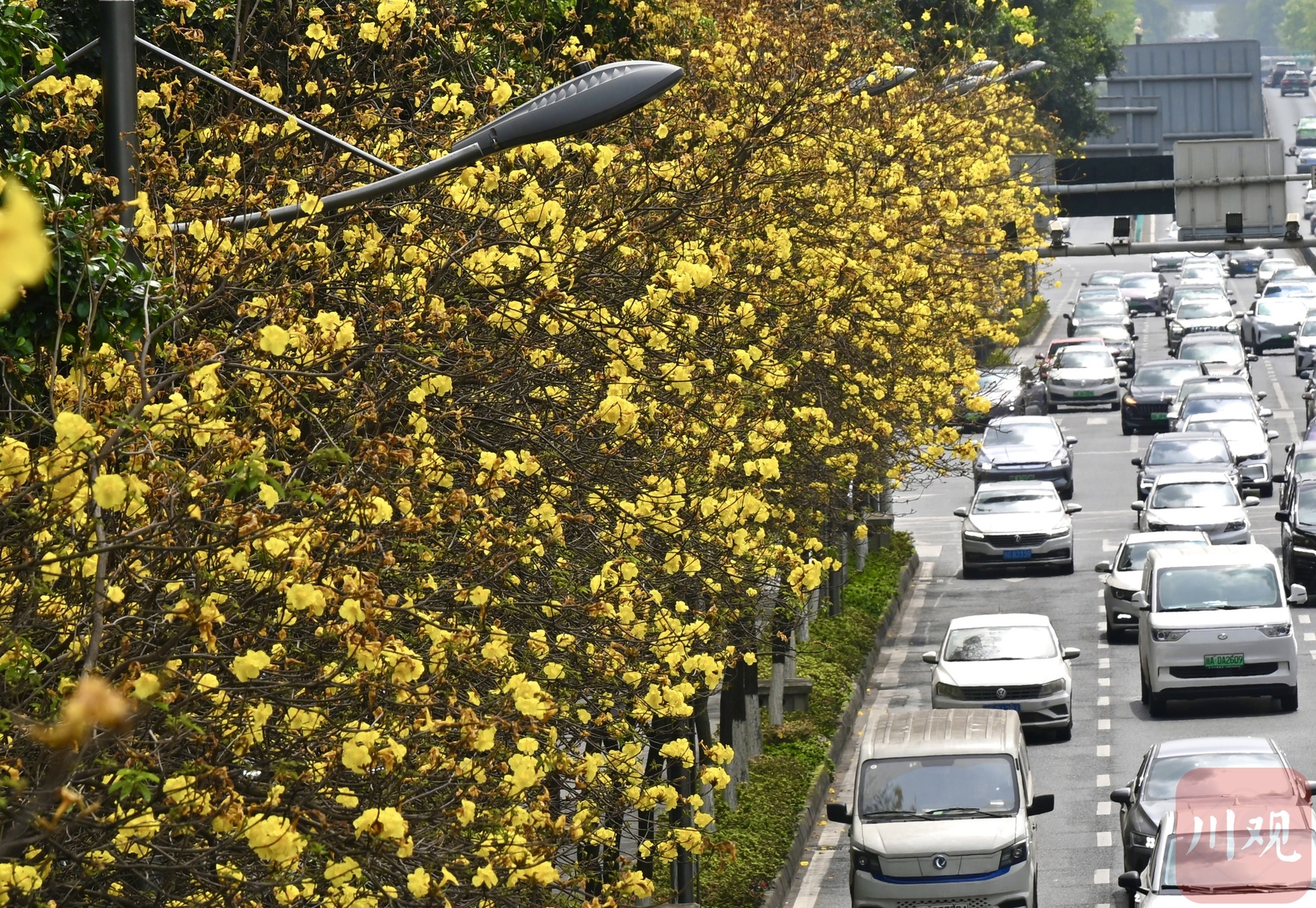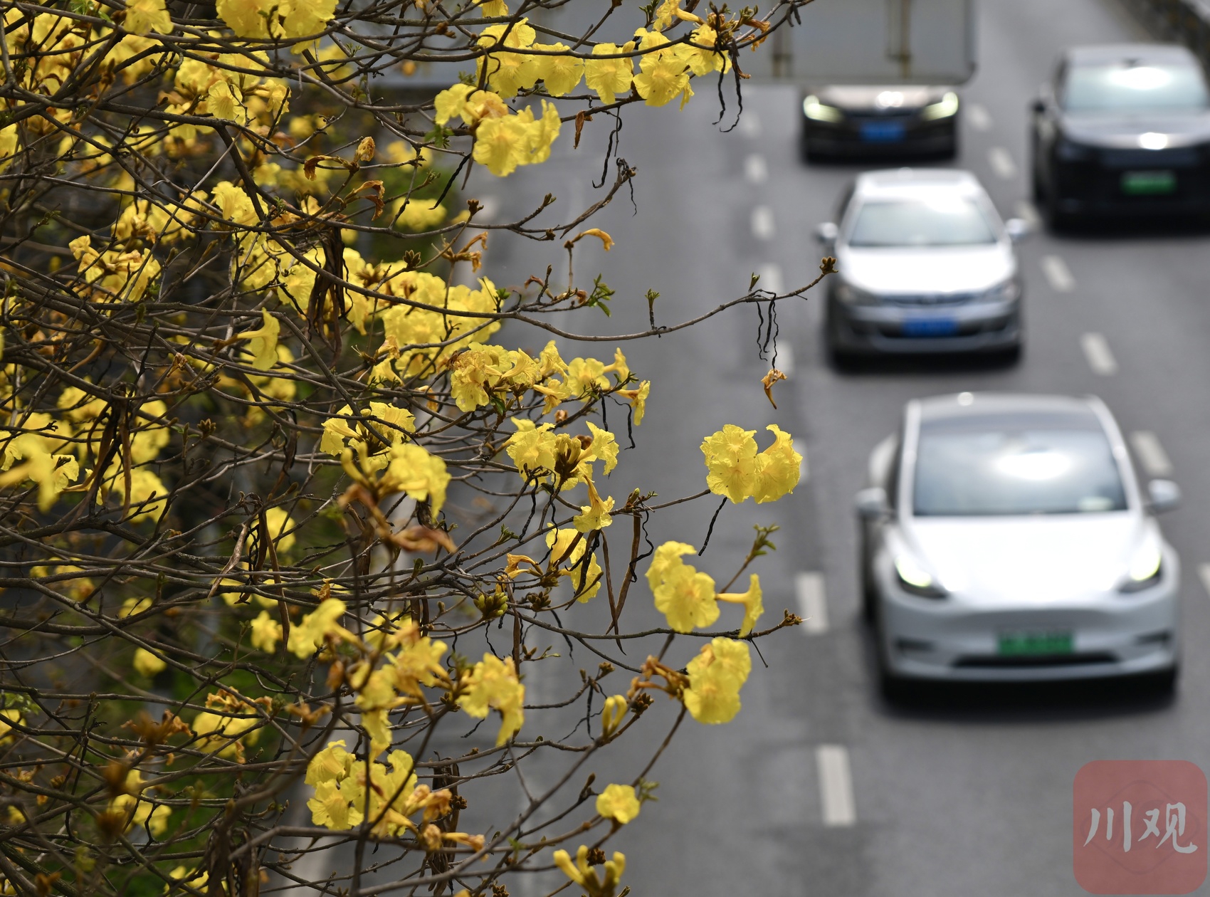 暖阳之下,金黄花簇与城市街景相映成趣,不少市民、游客驻足拍照打卡,定格春日美好。据悉,成都街头的黄花风铃木正处于盛花期尾声,想要打卡的市民和游客需抓紧时间。