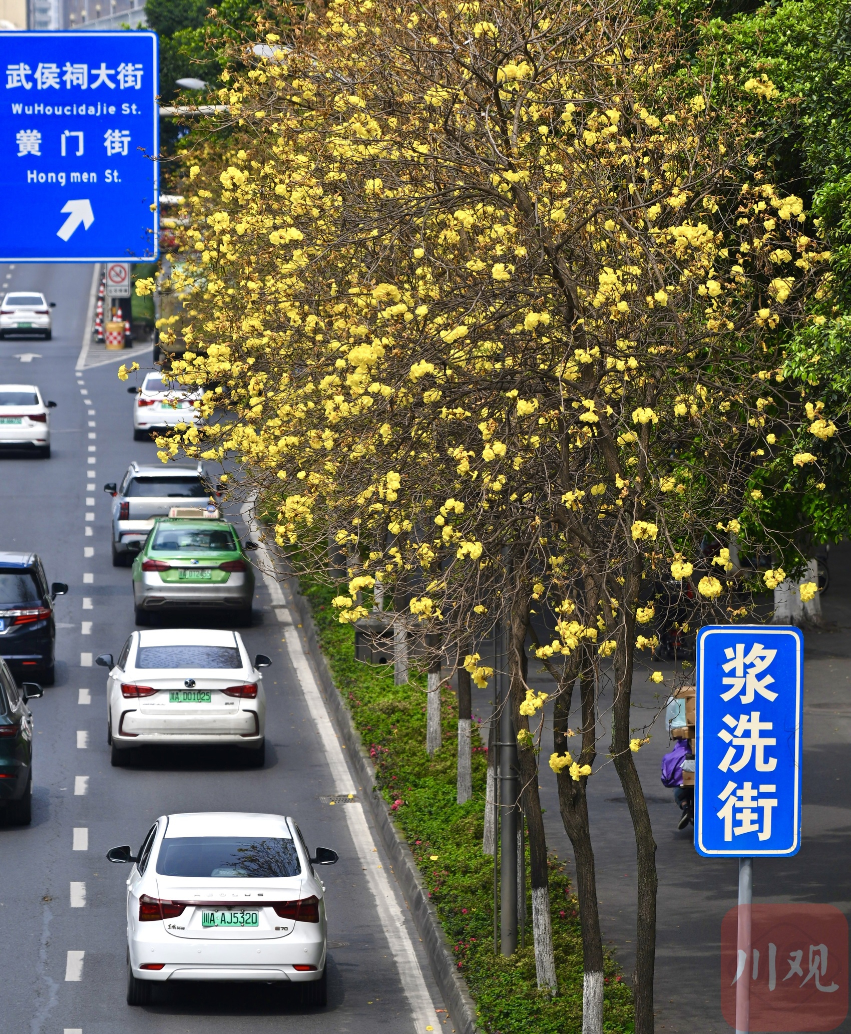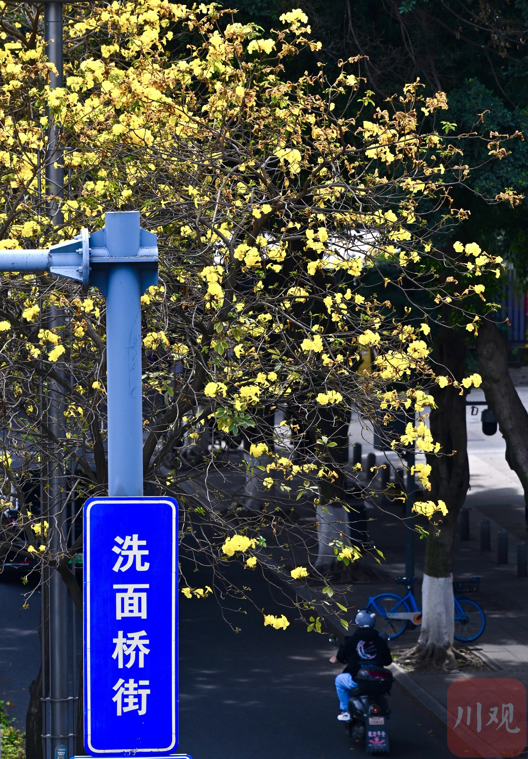成都市洗面桥街、浆洗街两侧的黄花风铃木竞相绽放。