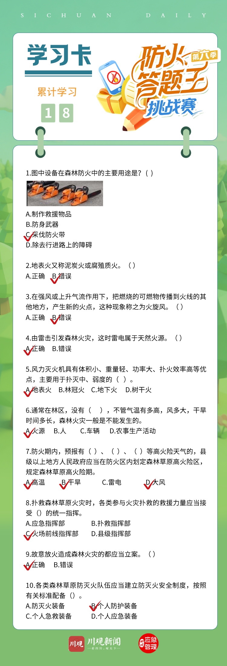 森林防火无小事,牢记知识是关键!新一期防火“答题王”学习卡来啦。防火期内,预报有高温、干旱、大风等高火险天气的,县级以上地方人民政府应当在防火区内划定森林草原高火险区,规定森林草原高火险期。通常林区没有火源,不管气温有多高、风多大、干旱时间多长,森林火灾一般是不能发生的,所以切记勿带火源前往。各类森林草原防灭火队伍应当建立防灭火安全制度,按照有关标准配备个人防护装备。森林防火,人人有责!记牢知识点,变身“答题王”!