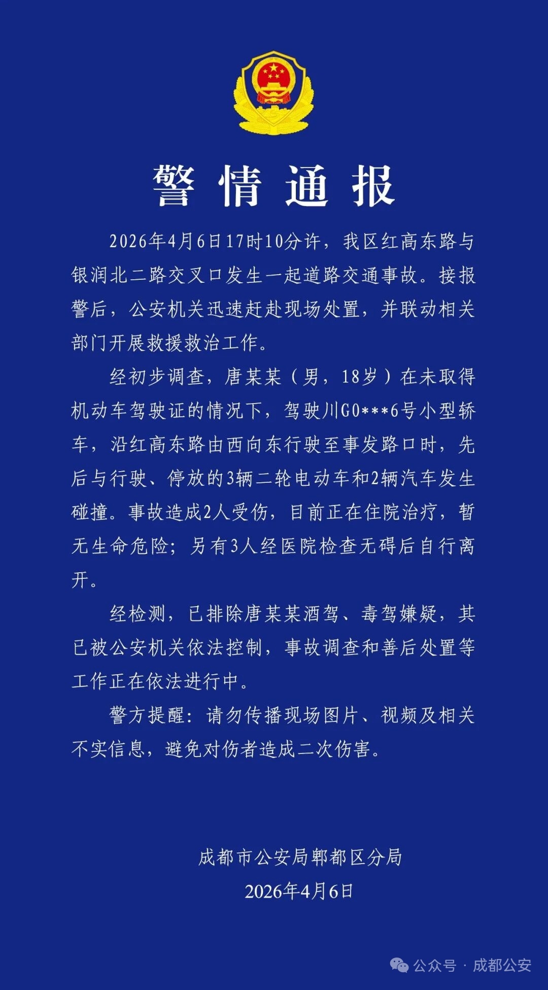 4月6日,成都市公安局郫都区分局发布警情通报: