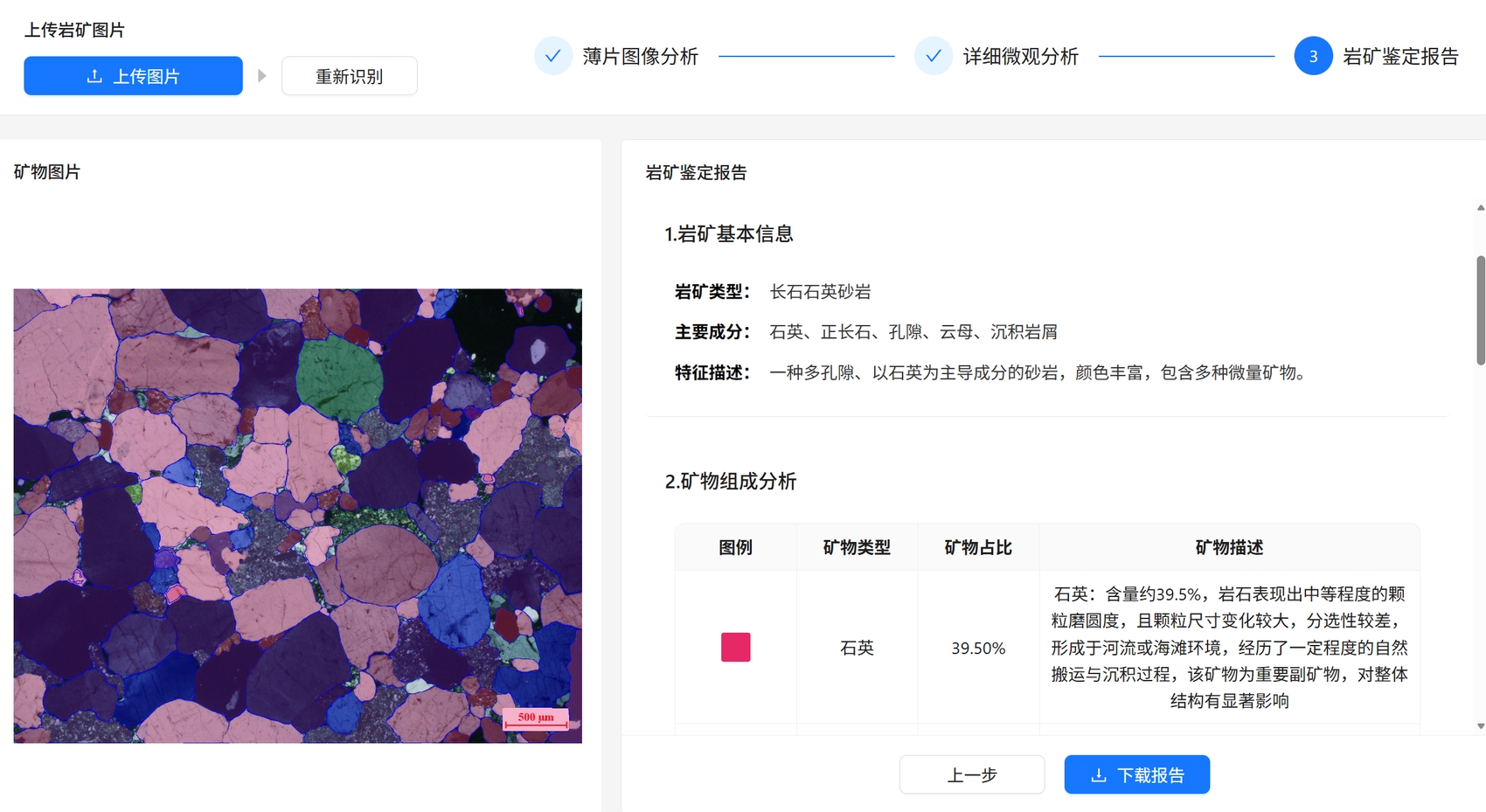 借助“岩石薄片智能识别”,地质工作者能够在几分钟内了解到岩石成分,岩矿鉴定效率提升200%、降低成本90%。“过去矿石磨成薄片后,要靠专业人员在显微镜下鉴定,相关专业人才少、耗时长。”郑立波现场演示,拍摄显微镜下的岩石薄片,上传到系统,不到一分钟,系统给出岩矿成分:石英53.6%、孔隙15.9%、正长石7.7%……